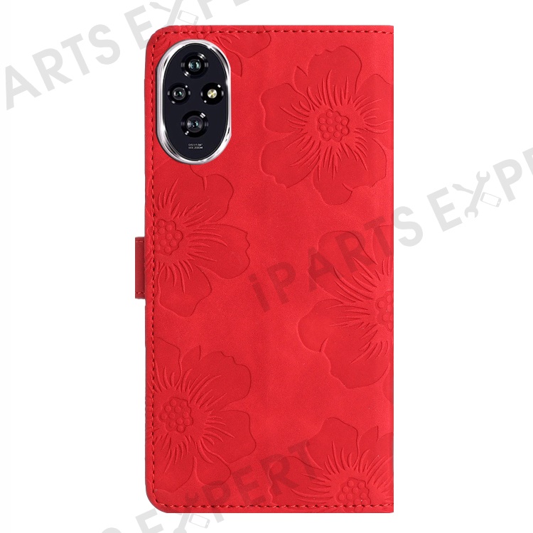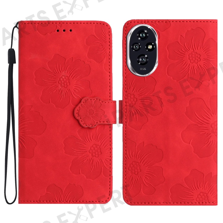 For Honor 200 5G Case Flower Design Leather Wallet Phone Cover with Wrist Strap - Red