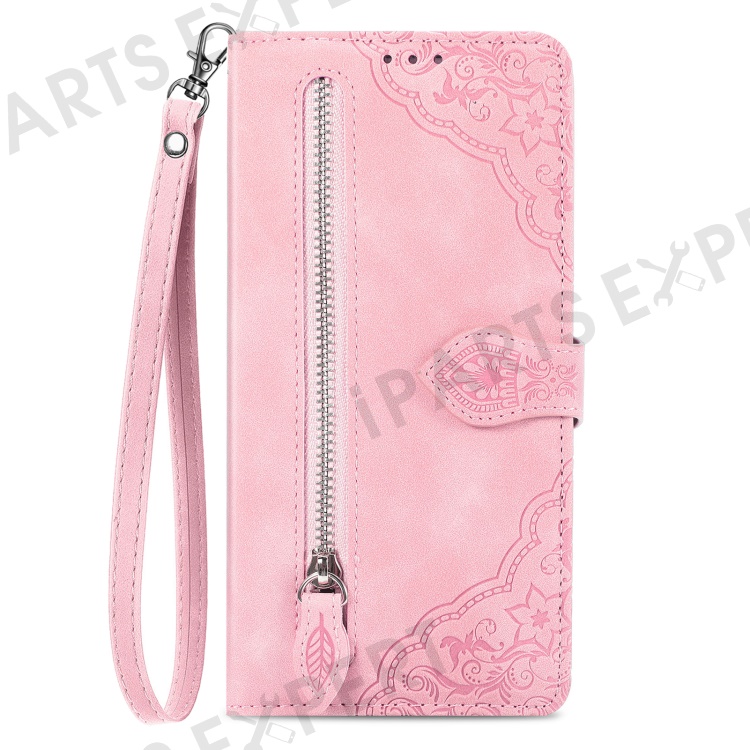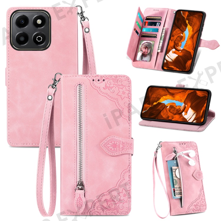 For Honor 200 Smart 5G / X7c 4G Zipper Wallet Case with Strap Flower Imprint PU Leather Phone Cover - Pink