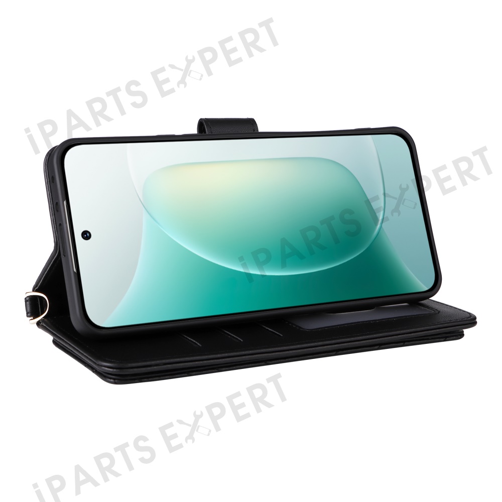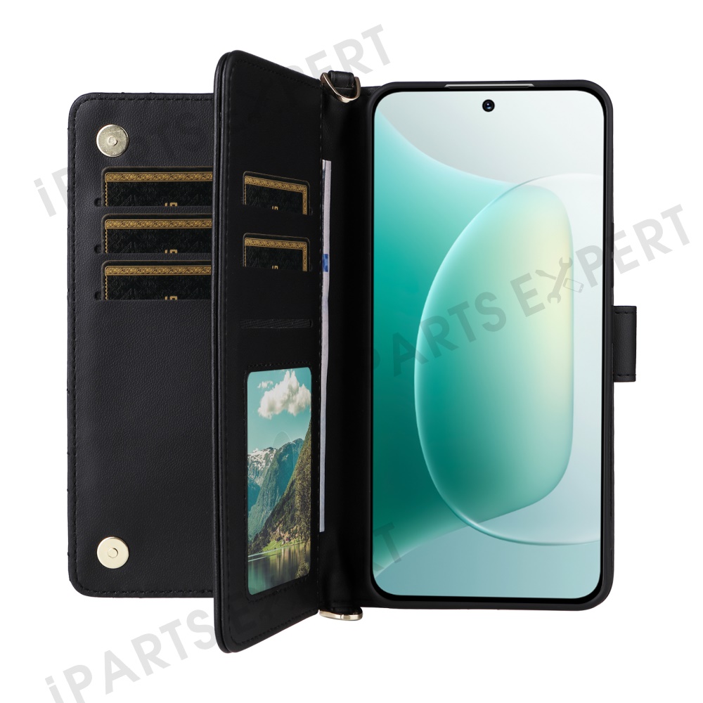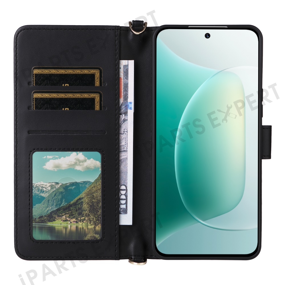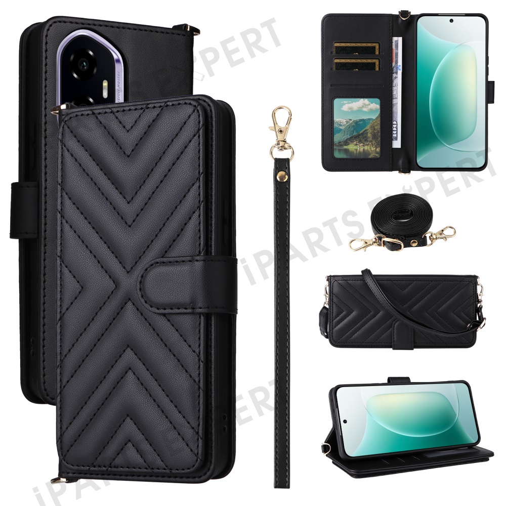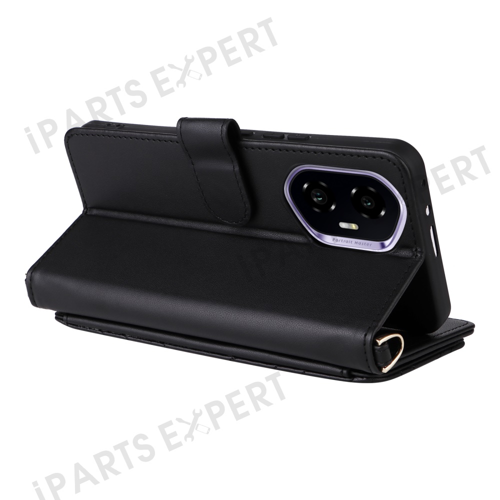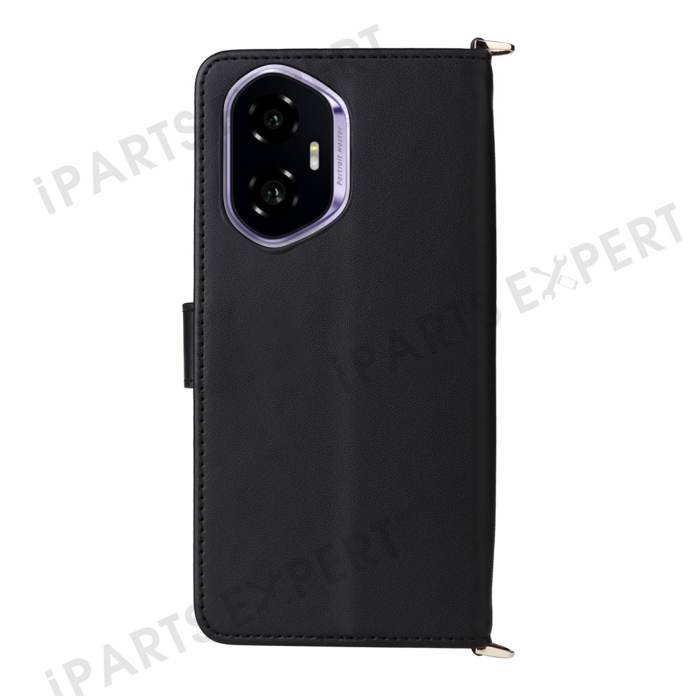 For Honor 300 Wallet Case with Shoulder / Wrist Strap Leather Phone Cover Stand - Black