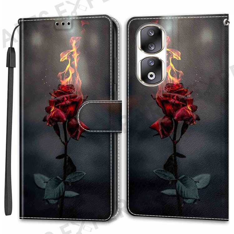 For Honor 90 Pro Case PU Leather Pattern Printing Stand Cover - Fire Rose