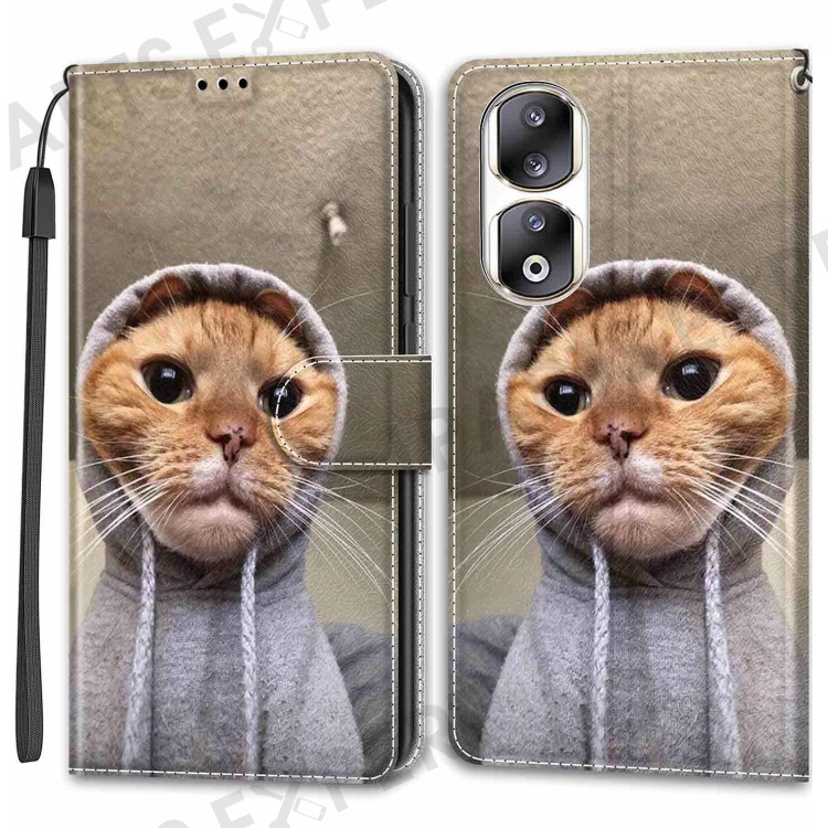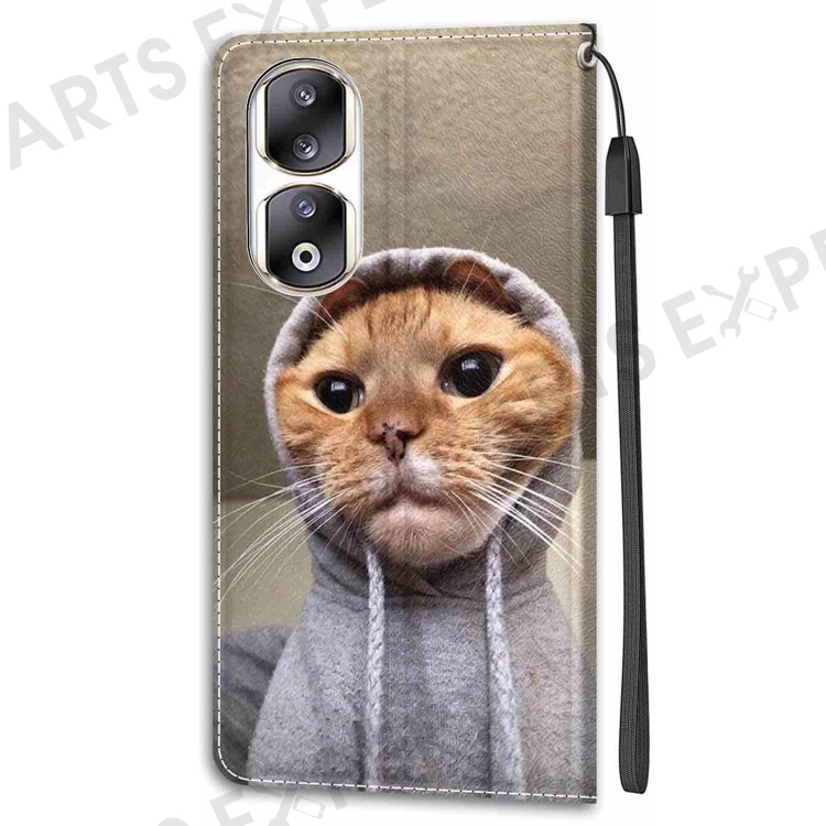 For Honor 90 Pro Case PU Leather Pattern Printing Stand Cover - Yellow Cat / Sweater