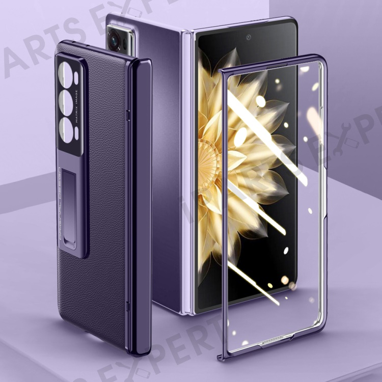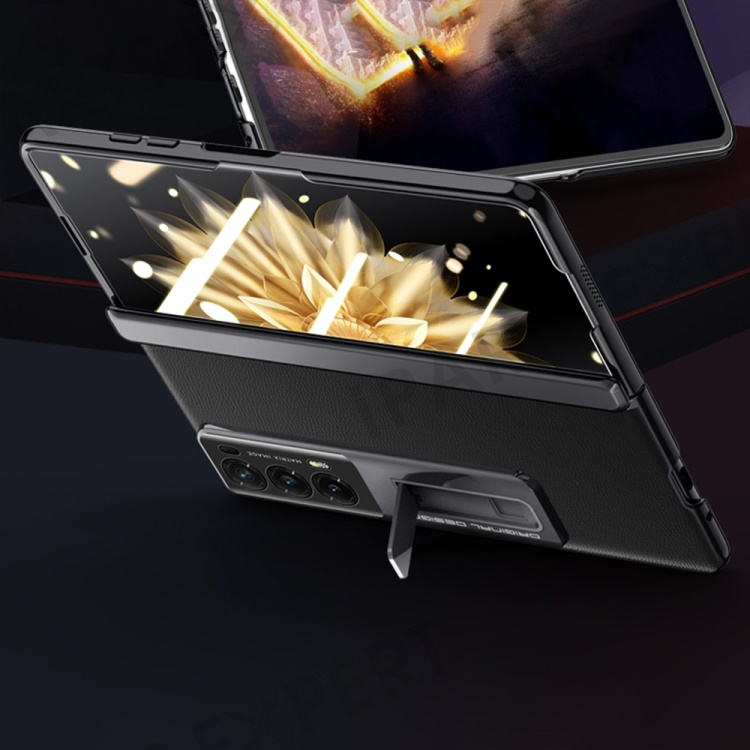 For Honor Magic V2 5G PU Leather Coated PC Phone Case Electroplating Hinge Protection Kickstand Cover with Clear Tempered Glass Film - Black