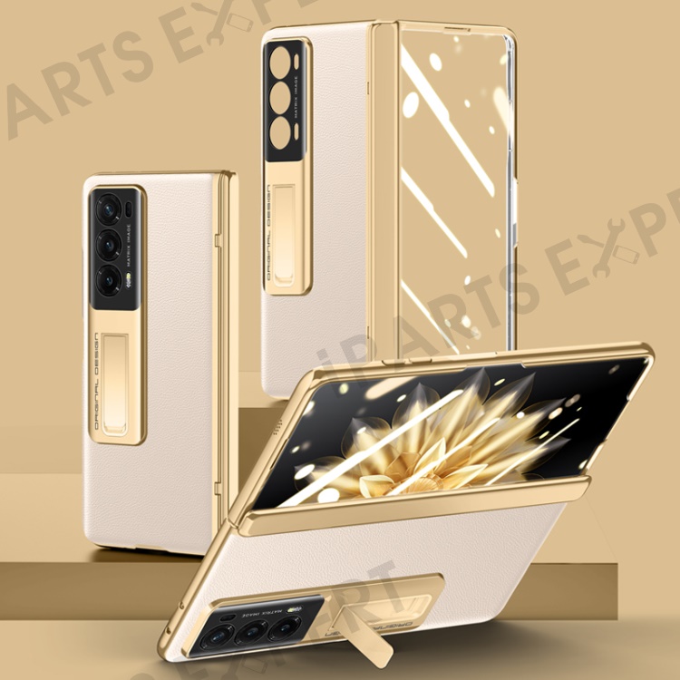 For Honor Magic V2 5G PU Leather Coated PC Phone Case Electroplating Hinge Protection Kickstand Cover with Clear Tempered Glass Film - Gold