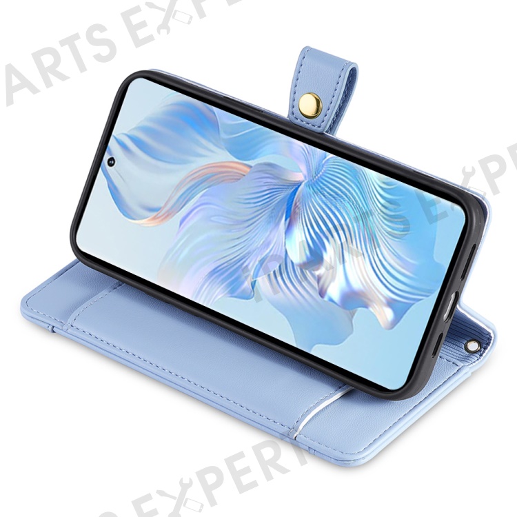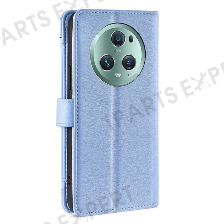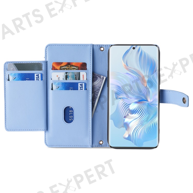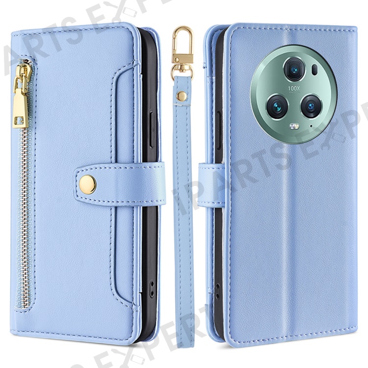 For Honor Magic5 Pro Phone Stand Leather Case Drop-Proof Zipper Pocket Wallet Cover with 2 Straps - Blue