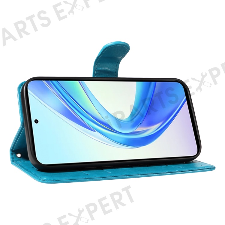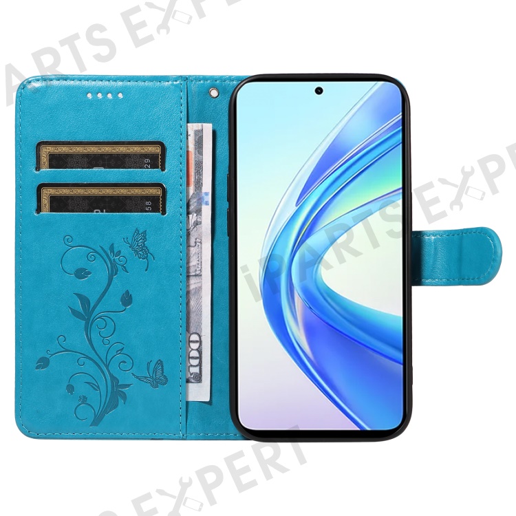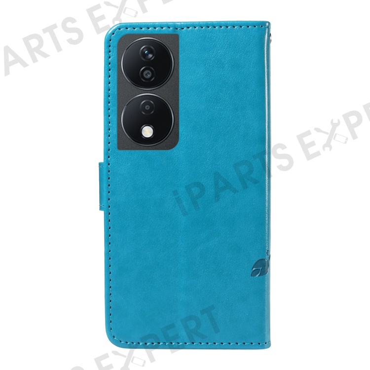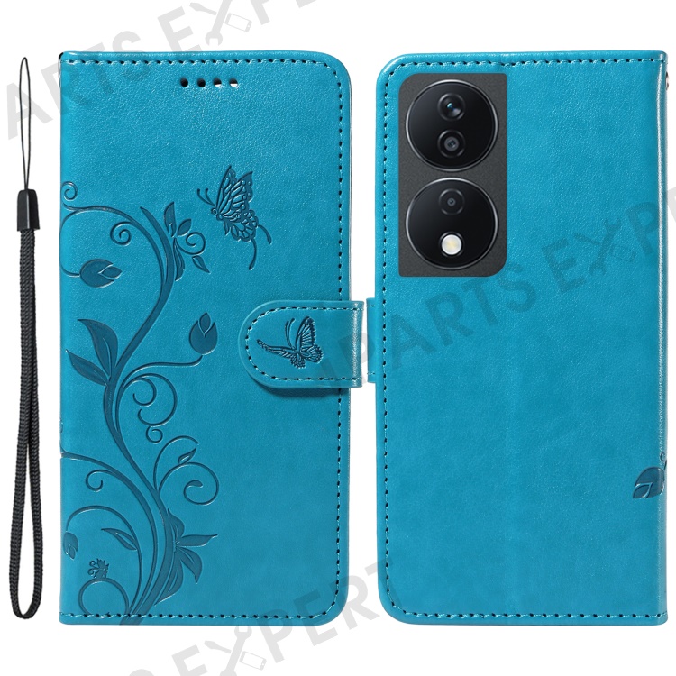 For Honor X7b 4G / 90 Smart PU Leather Cases Flower Pattern Wallet Stand Phone Cover with Strap - Blue