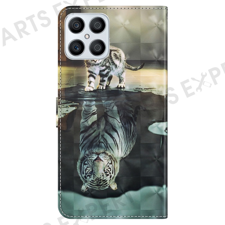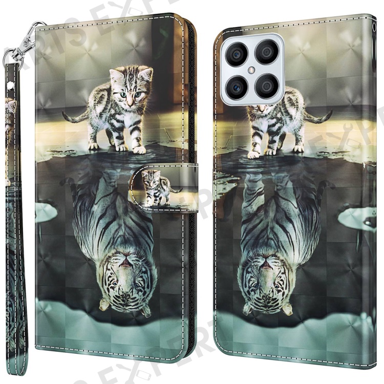 For Honor X8 4G 4G PU Leather Folio Flip Wallet Phone Case Stand Function 3D Creative Pattern Printed Design Full-Body Protective Cover with Strap - Cat / Tiger
