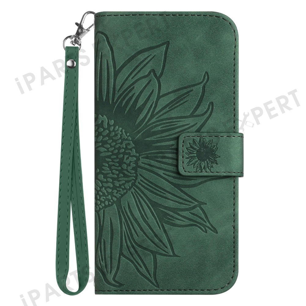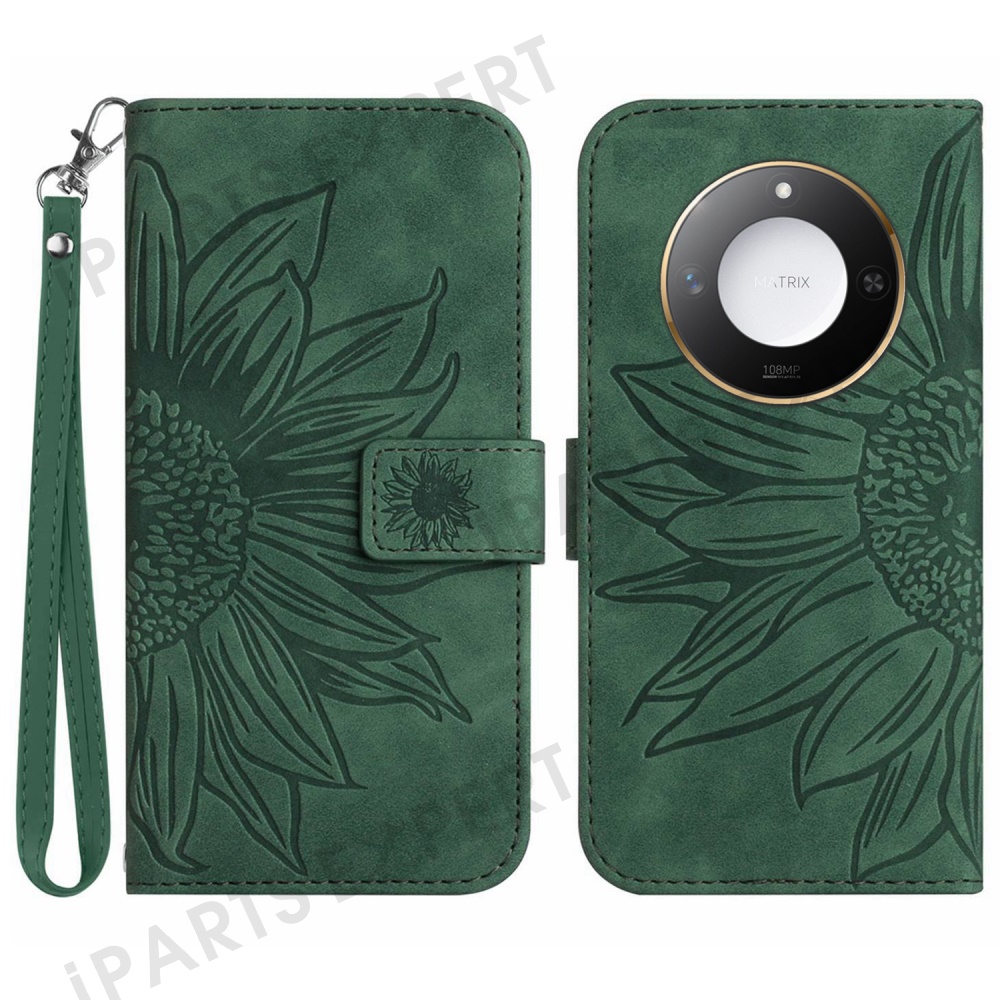 For Honor X9c Smart 5G Case Sunflower Imprint Leather Wallet Phone Cover with Wrist Strap - Dark Green