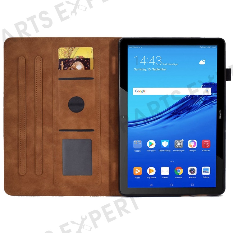 For Huawei MediaPad T5 10.1 Pattern Imprinted Smart Tablet Case PU Leather Card Slots Folio Stand Cover with Pencil Holder - Brown