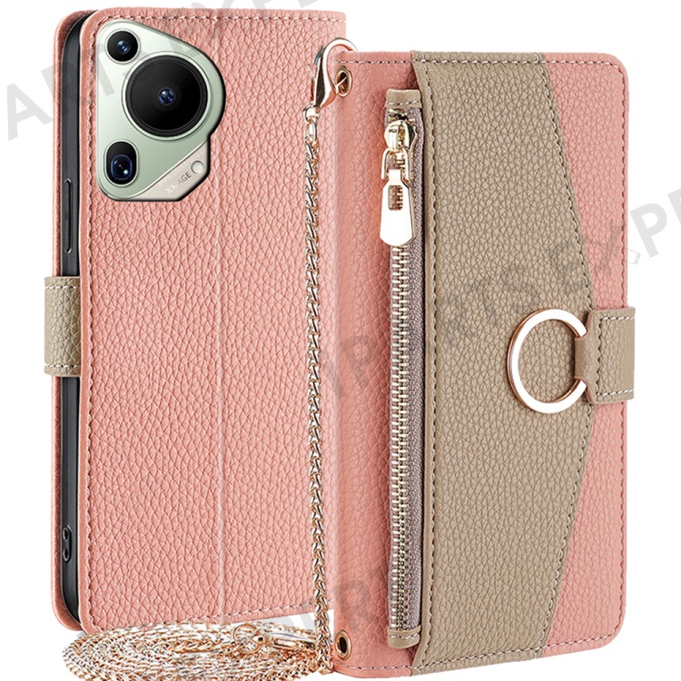 For Huawei Pura 70 Ultra Stand Case Zipper Wallet Magnetic Phone Cover with Mirror Function - Pink