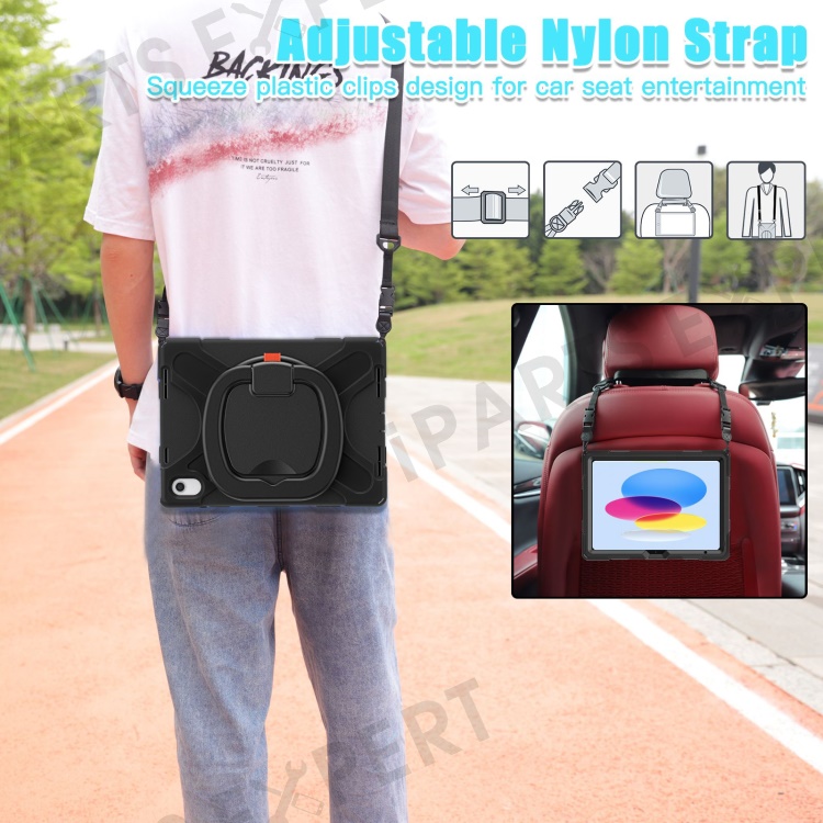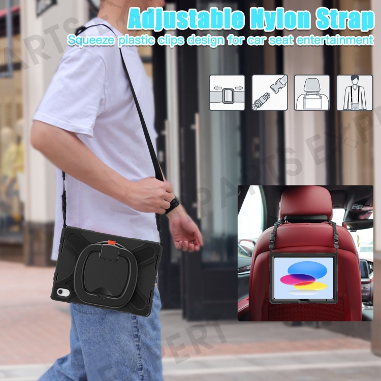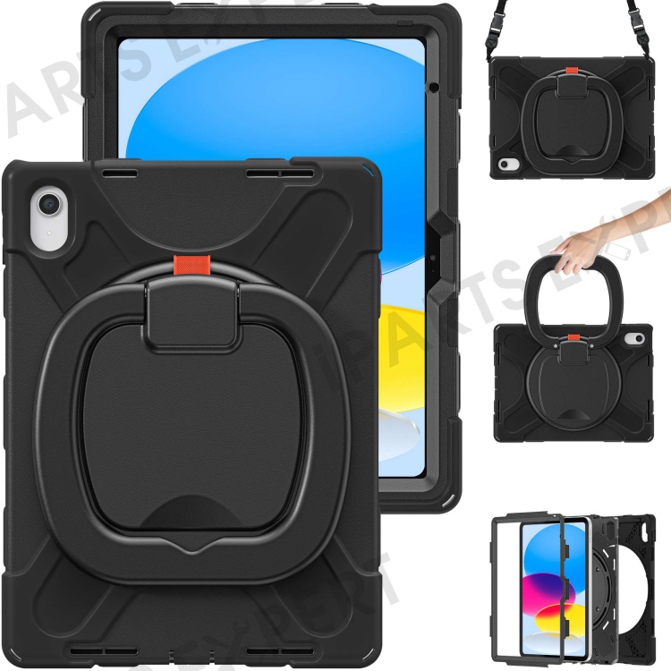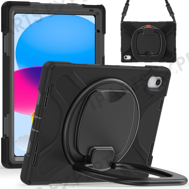 For iPad (2025) / 10.9 (2022) Rotary Kickstand Tablet Protective Case PC + Silicone Anti-Drop Back Cover with Shoulder Strap - Black