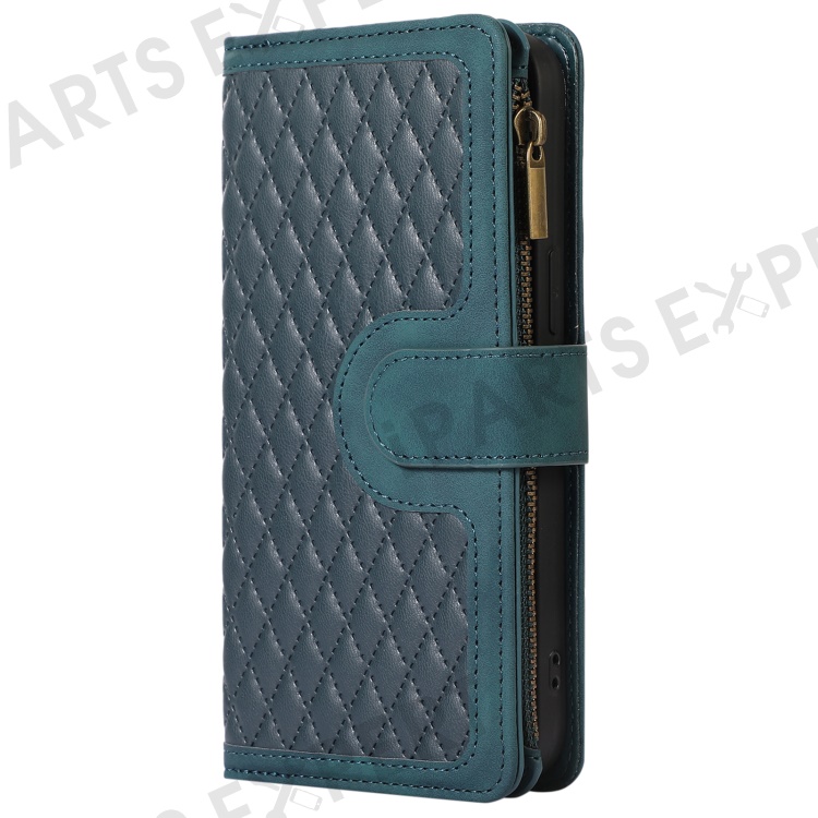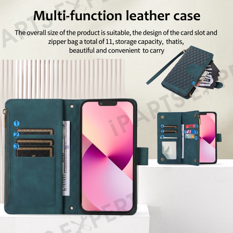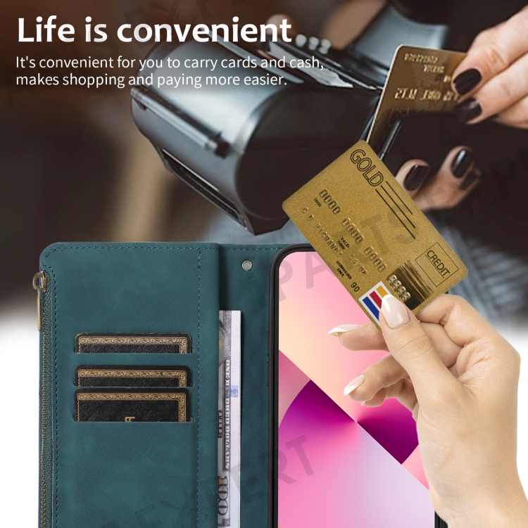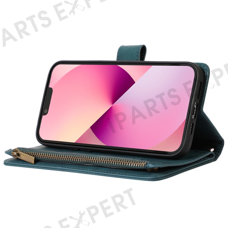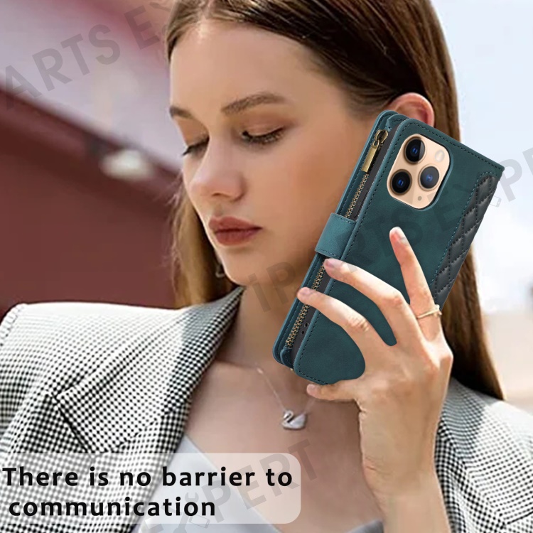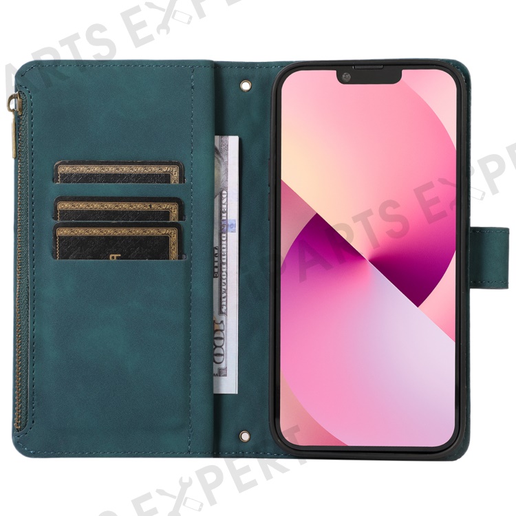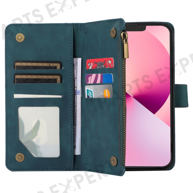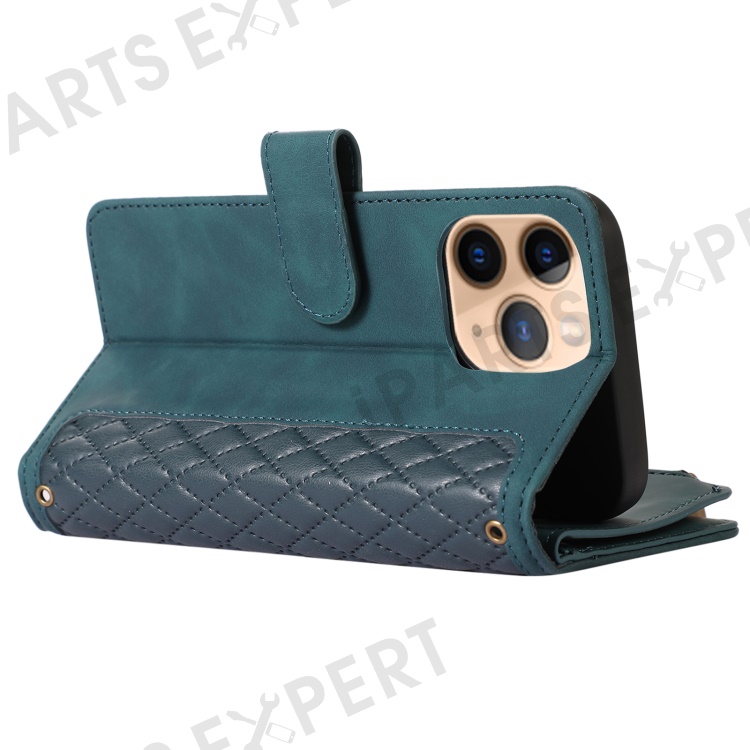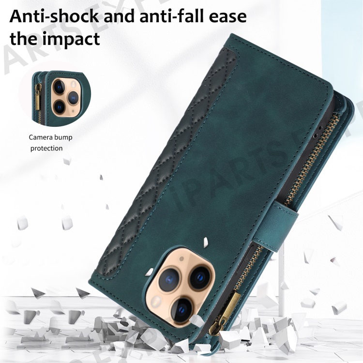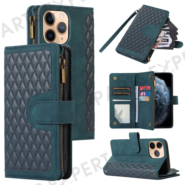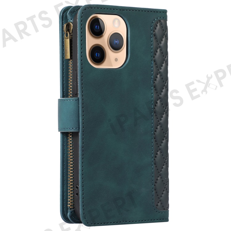 For iPhone 11 Pro Case Zipper Pocket Leather 9 Card Slots Phone Guard Cover with Wrist Strap - Green