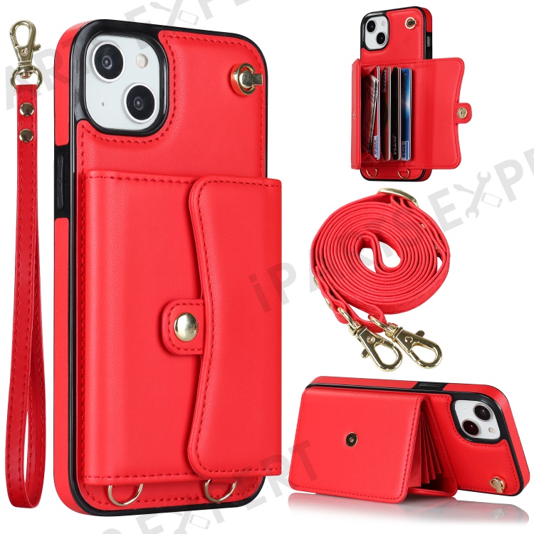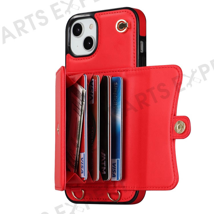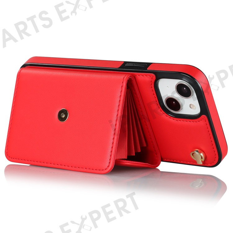 For iPhone 13 6.1 inch / 14 Accordion Style Card Slots Phone Case Kickstand RFID Blocking Cover with Short Strap and Long Strap - Red