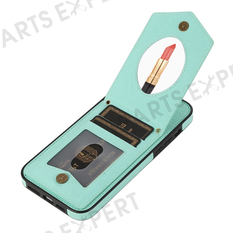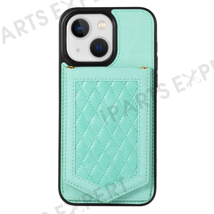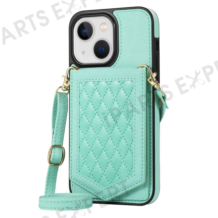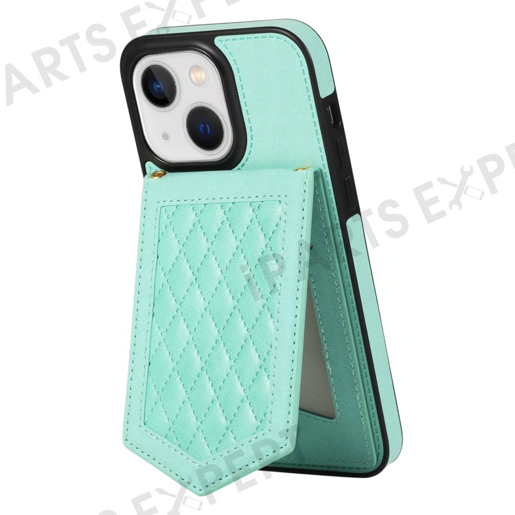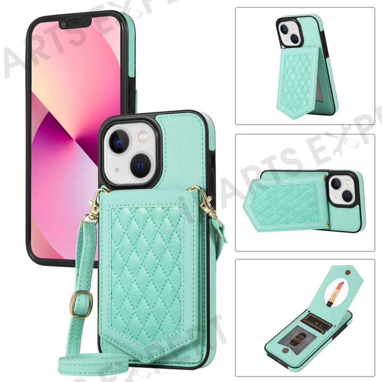 For iPhone 13 6.1 inch Imprinted Rhombus Makeup Mirror Kickstand Case PU Leather Coated TPU Card Slot RFID Blocking Phone Cover with Shoulder Strap - Mint Green