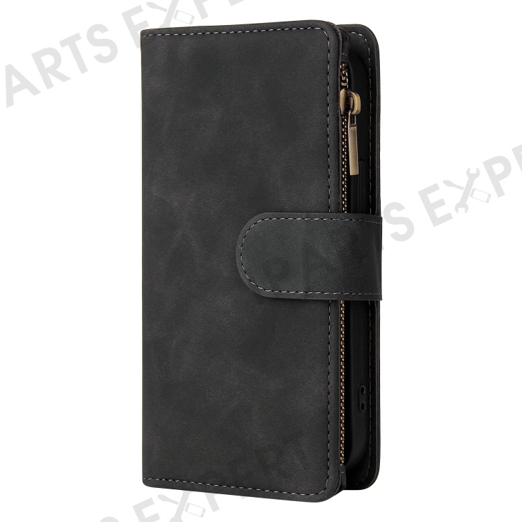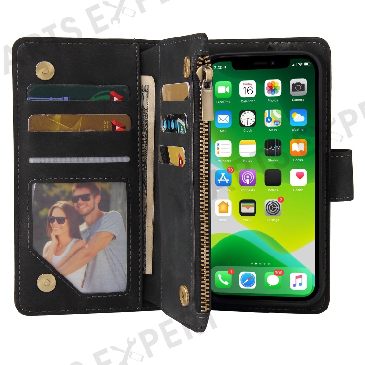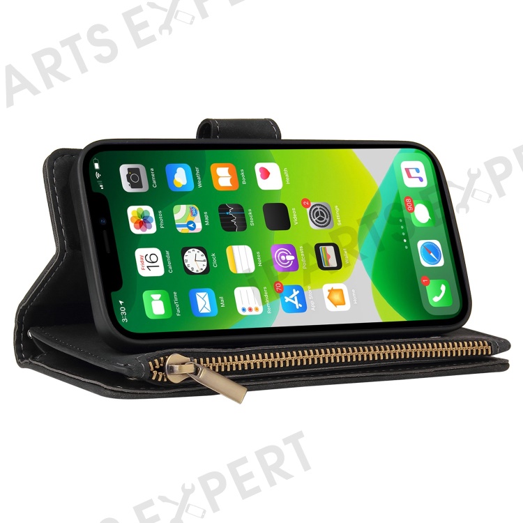 For iPhone 13 6.1 inch PU Leather Full Protection Phone Stand Cover Card Slots Wallet Protective Case with Zipper Pocket - Black