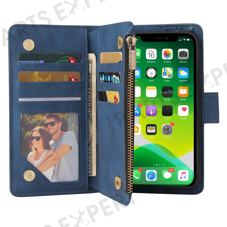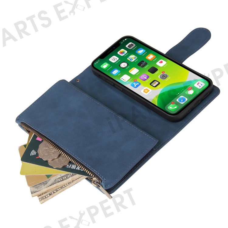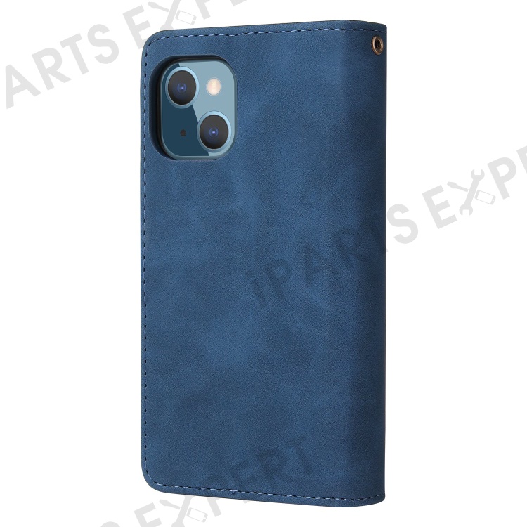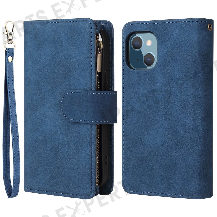 For iPhone 13 6.1 inch PU Leather Full Protection Phone Stand Cover Card Slots Wallet Protective Case with Zipper Pocket - Blue