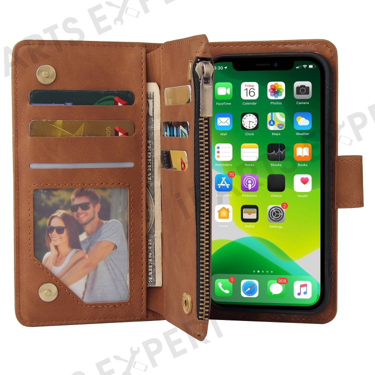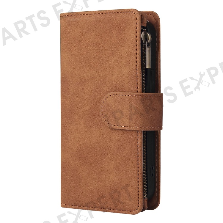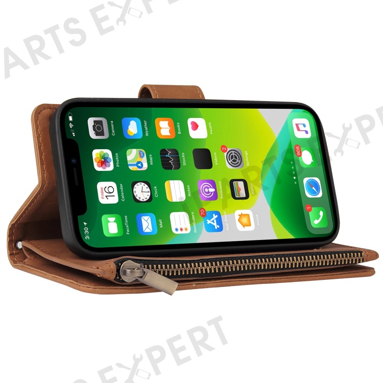 For iPhone 13 6.1 inch PU Leather Full Protection Phone Stand Cover Card Slots Wallet Protective Case with Zipper Pocket - Brown