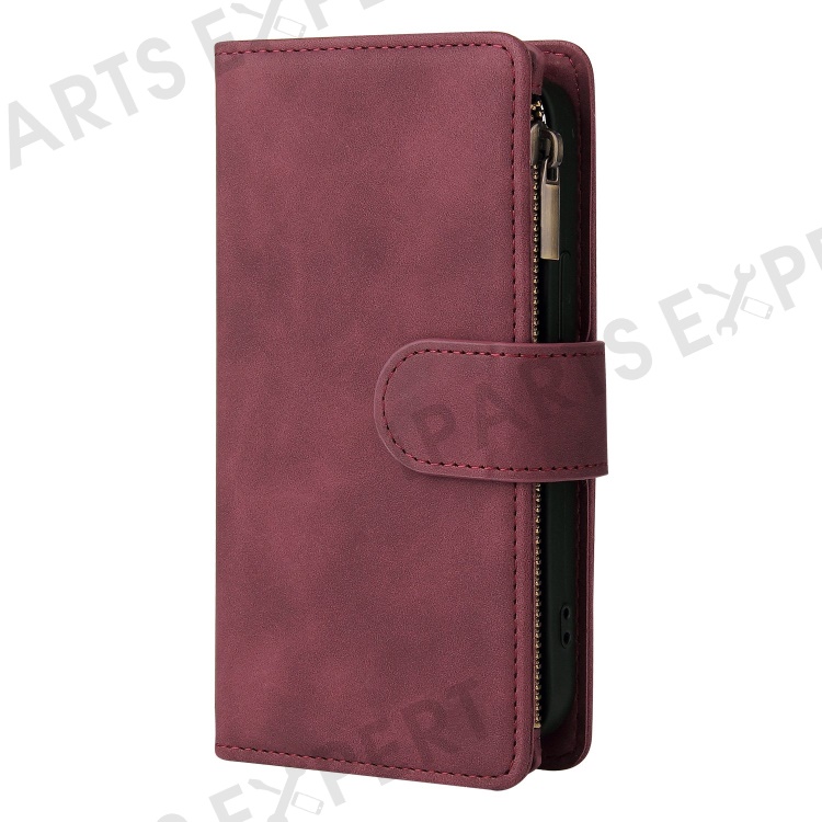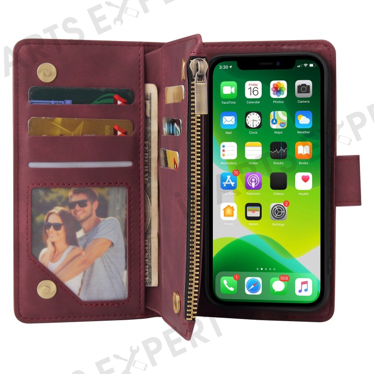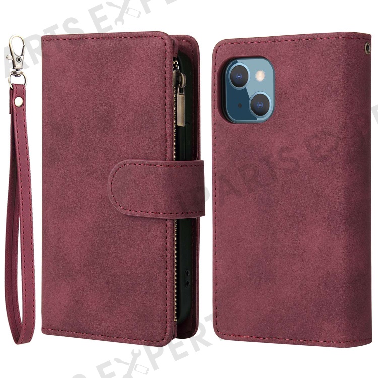 For iPhone 13 6.1 inch PU Leather Full Protection Phone Stand Cover Card Slots Wallet Protective Case with Zipper Pocket - Wine Red
