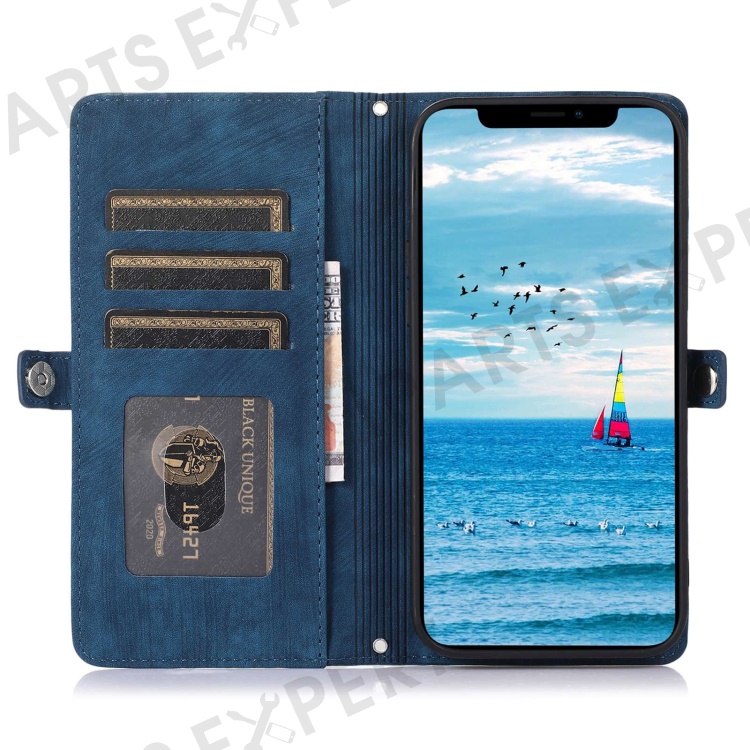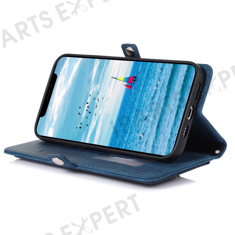 For iPhone 13 6.1 inch Zipper Pocket Design 9 Card Slots Protective Cover PU Leather Wallet Stand Case with Wrist Strap - Blue