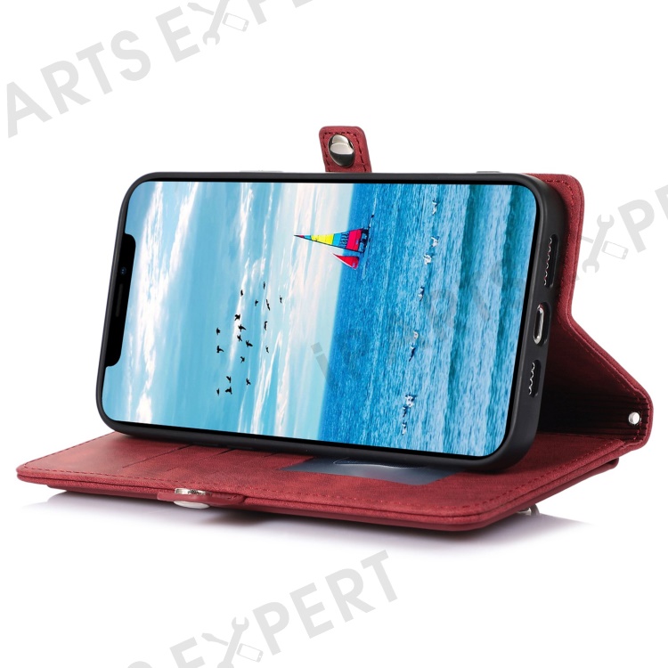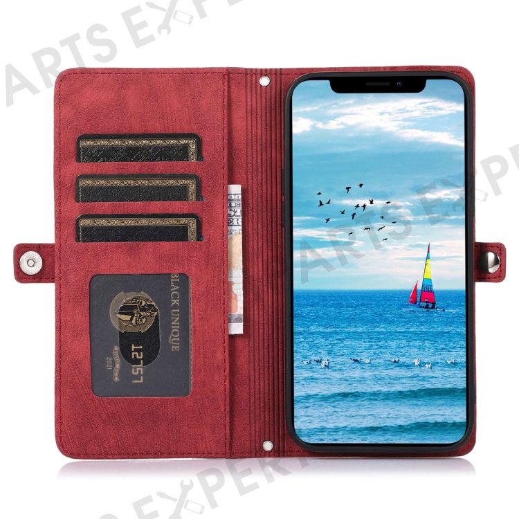 For iPhone 13 6.1 inch Zipper Pocket Design 9 Card Slots Protective Cover PU Leather Wallet Stand Case with Wrist Strap - Red