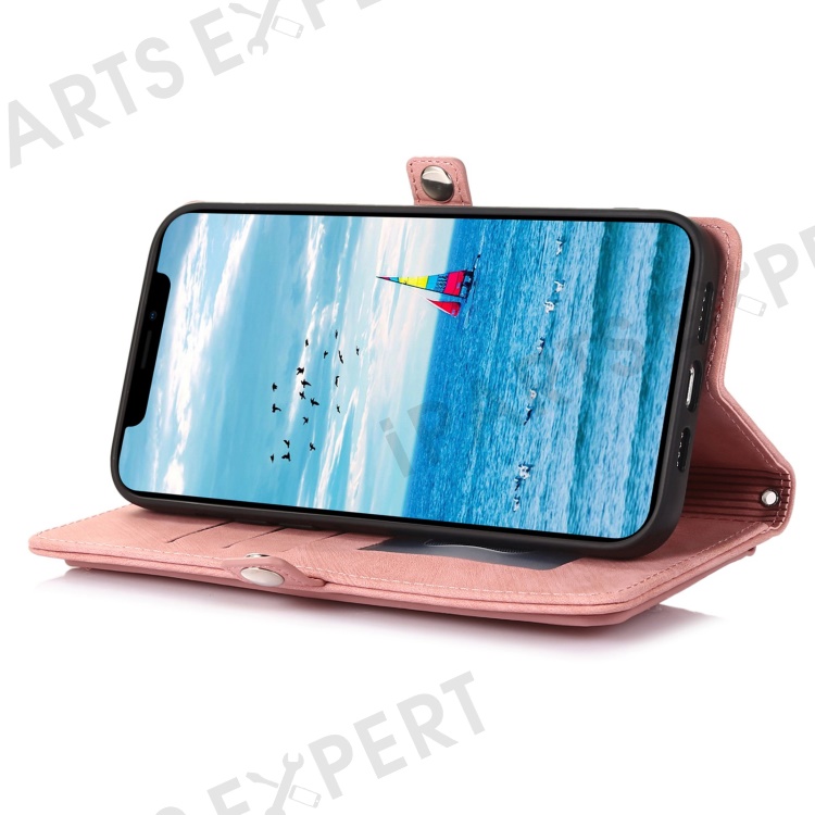 For iPhone 13 6.1 inch Zipper Pocket Design 9 Card Slots Protective Cover PU Leather Wallet Stand Case with Wrist Strap - Rose Gold