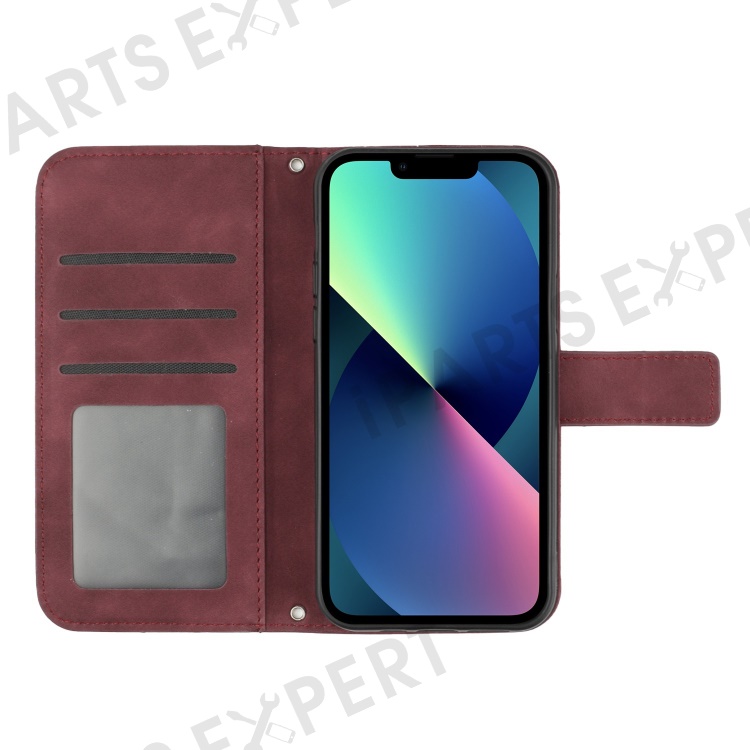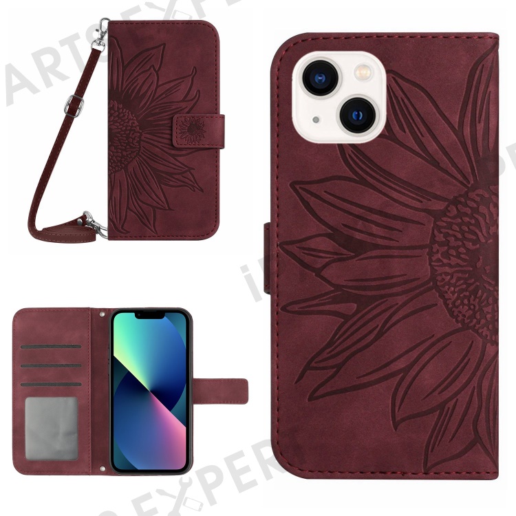 For iPhone 13 mini 5.4 inch HT04 Skin-touch PU Leather Imprinted Sunflower Stand Case Anti-scratch Phone Wallet Cover with Shoulder Strap - Wine Red
