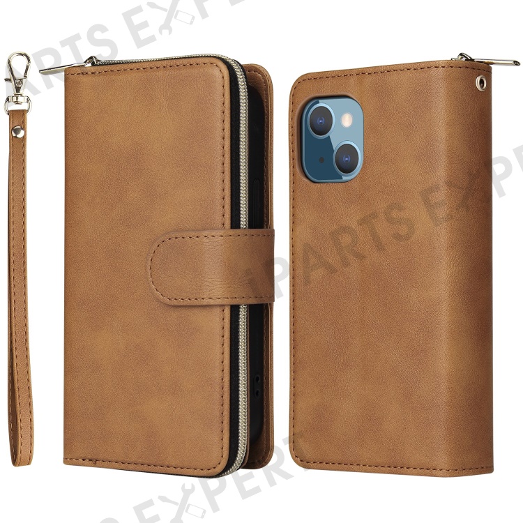 For iPhone 13 mini 5.4 inch Shockproof PU Leather Phone Case 9 Card Holder Slots Magnetic Closure Zipper Pocket Flip Wallet Stand Protective Phone Cover with Strap - Brown