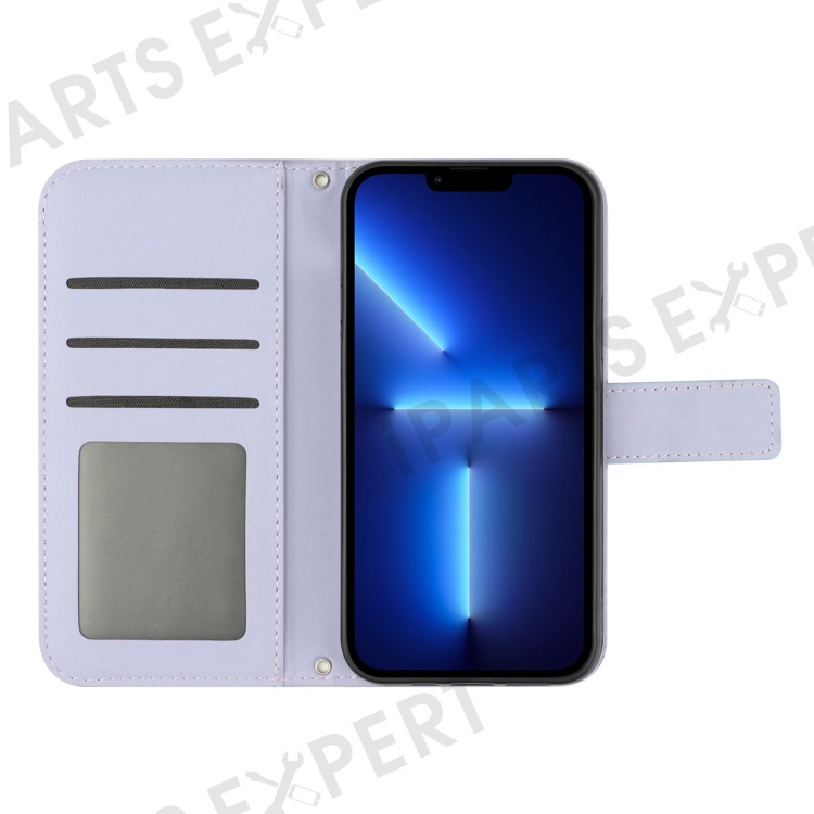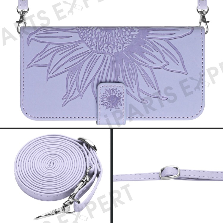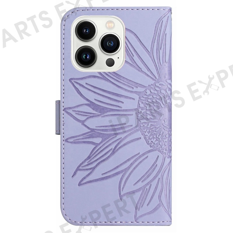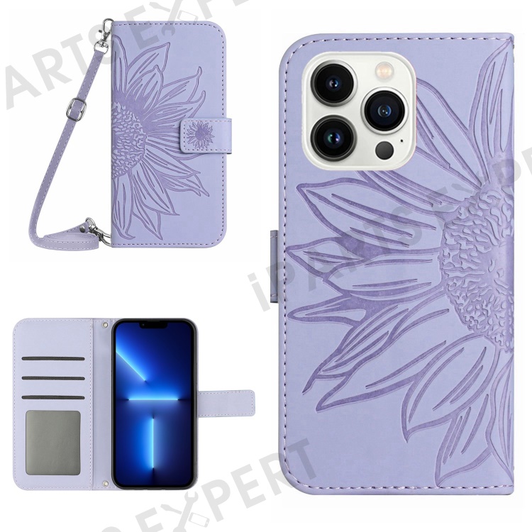 For iPhone 13 Pro 6.1 inch HT04 Imprinted Sunflower PU Leather Wallet Stand Cover Magnetic Clasp Skin-touch Phone Case with Shoulder Strap - Light Purple