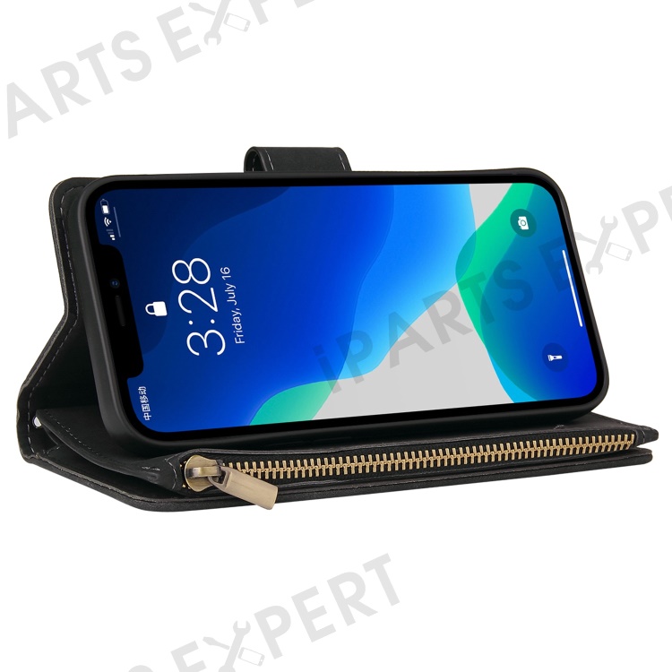 For iPhone 13 Pro 6.1 inch Zipper Pocket Design PU Leather Mobile Phone Wallet Stand Cover Multi Card Slots Drop-proof Case - Black