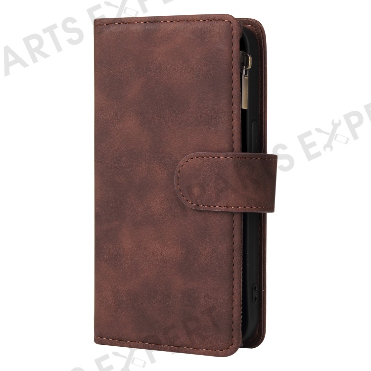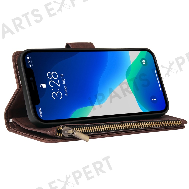 For iPhone 13 Pro 6.1 inch Zipper Pocket Design PU Leather Mobile Phone Wallet Stand Cover Multi Card Slots Drop-proof Case - Coffee