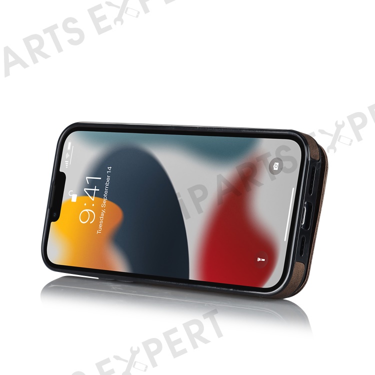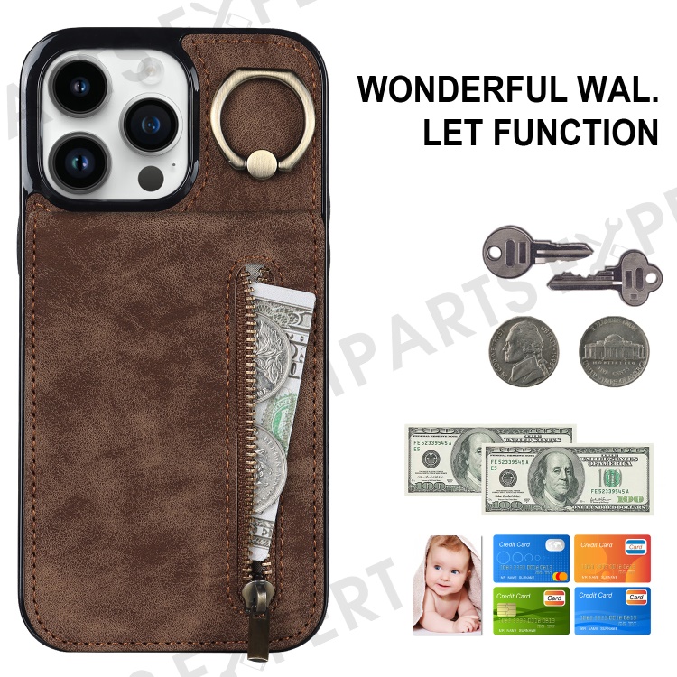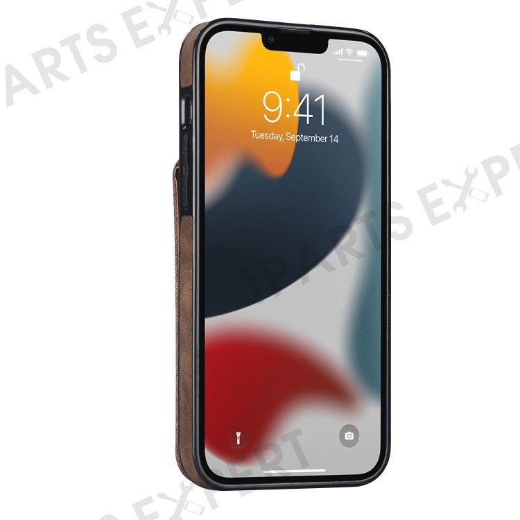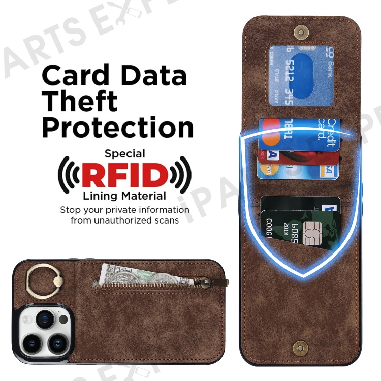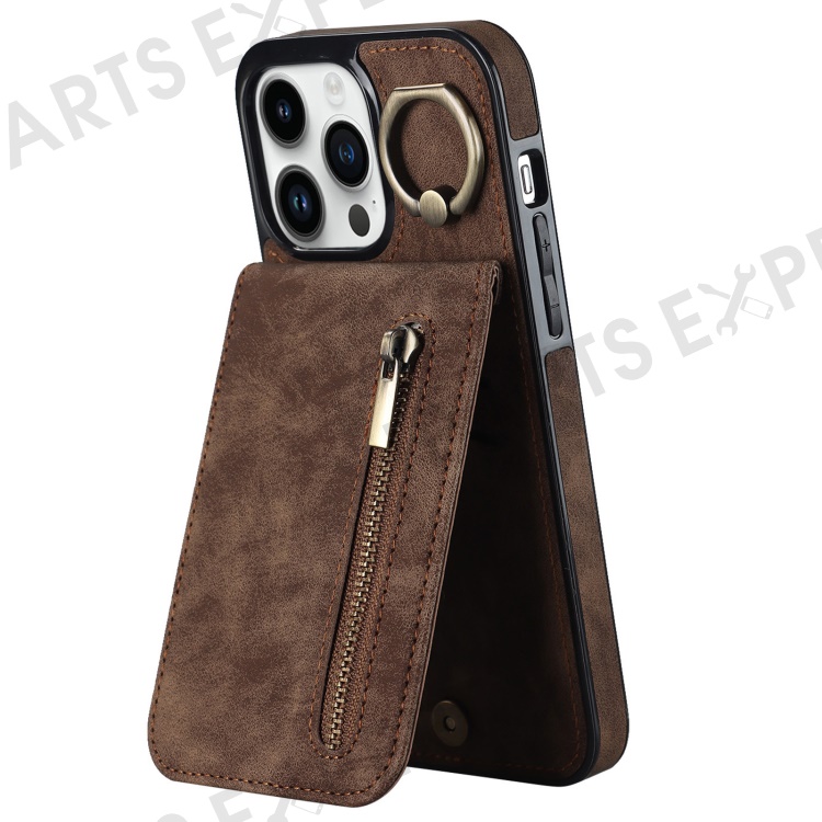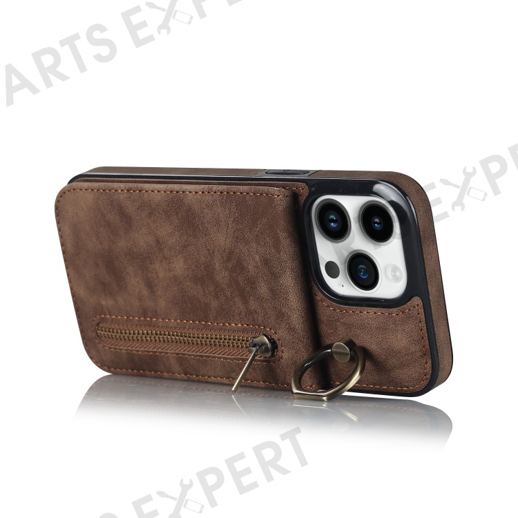 For iPhone 13 Pro Cell Phone Case Ring Kickstand RFID Blocking PU+TPU Cover - Brown