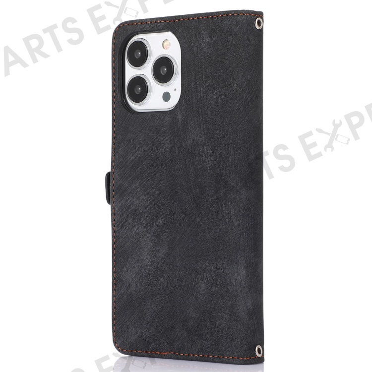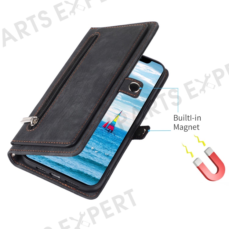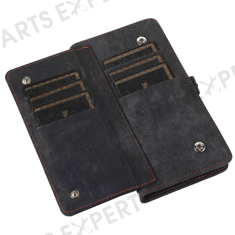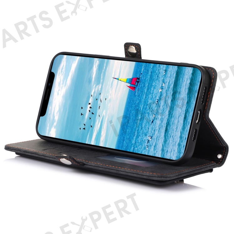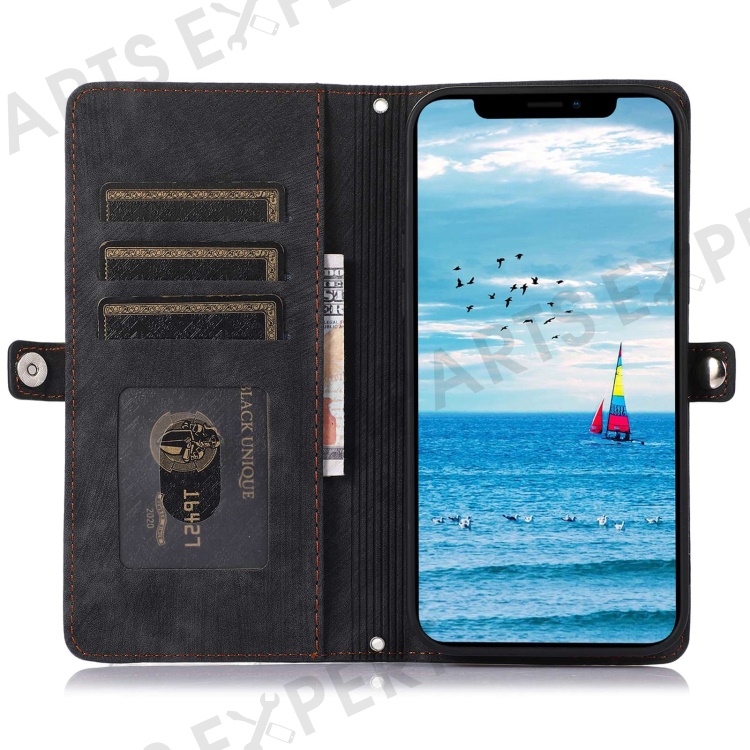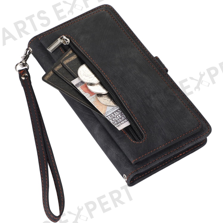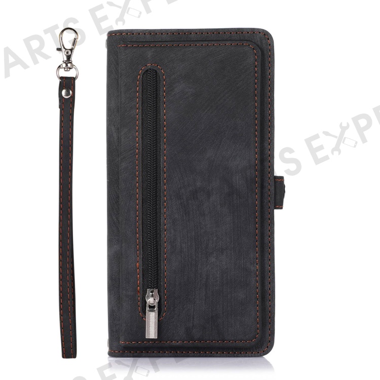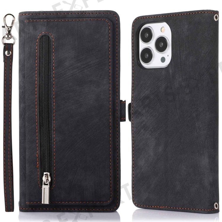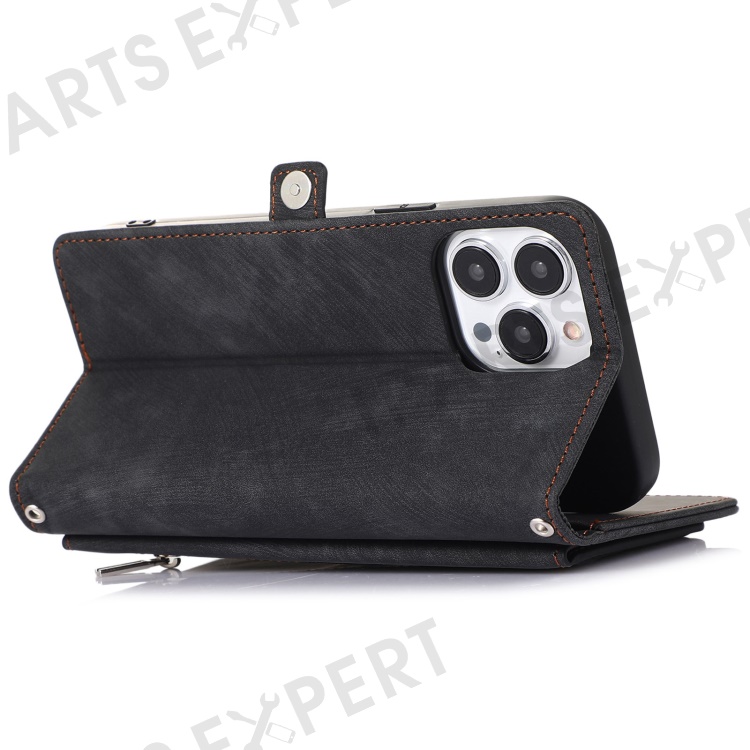For iPhone 13 Pro Max 6.7 inch Multi-Functional 9 Card Slots Stand Protective Cover PU Leather Wallet Case with Zipper Pocket and Wrist Strap - Black