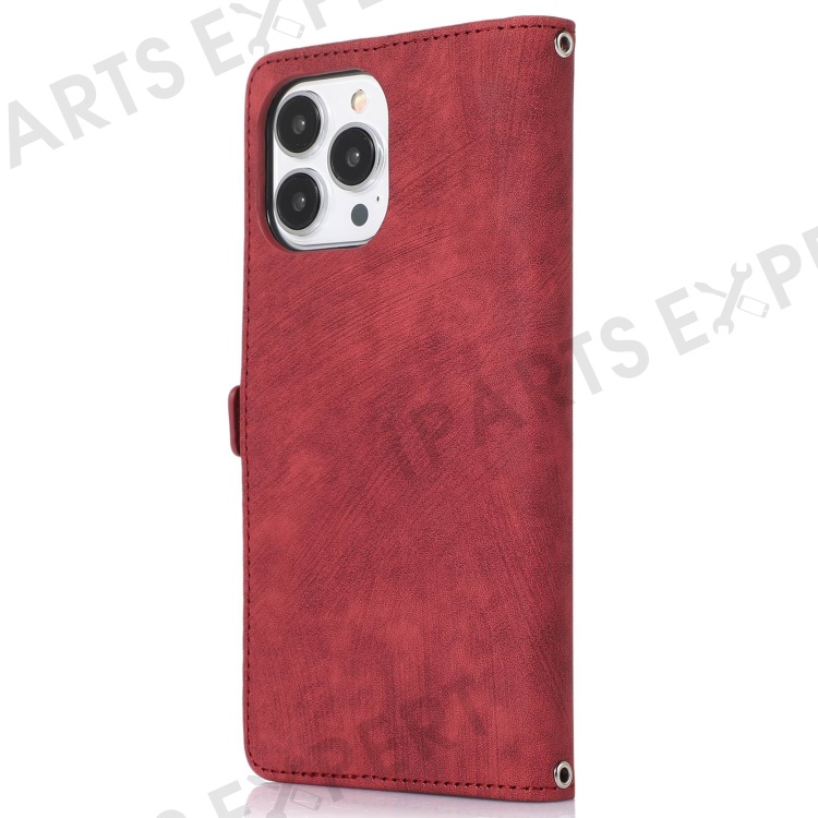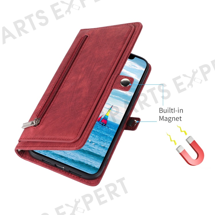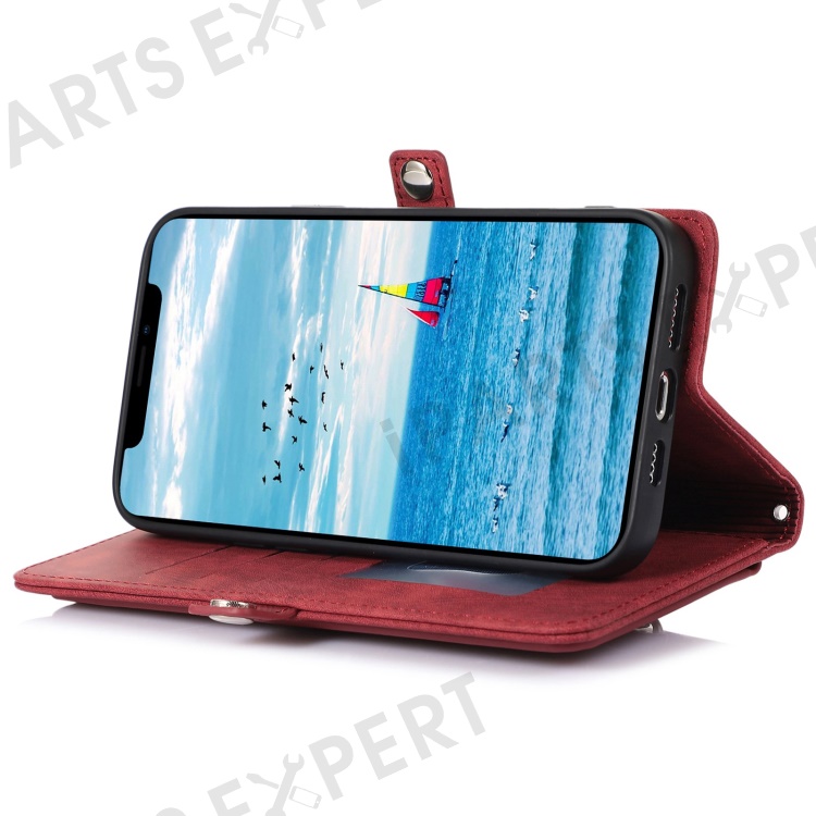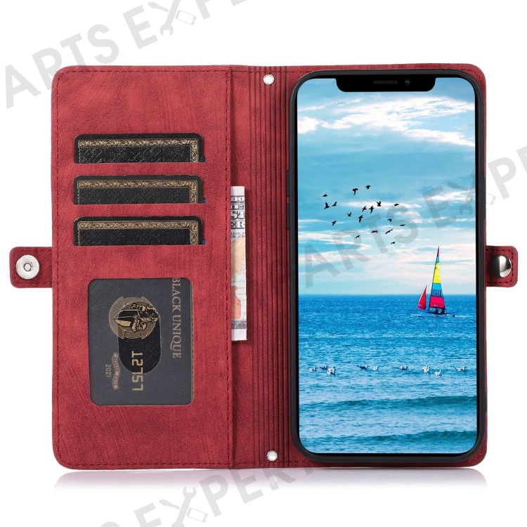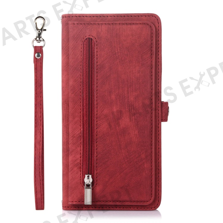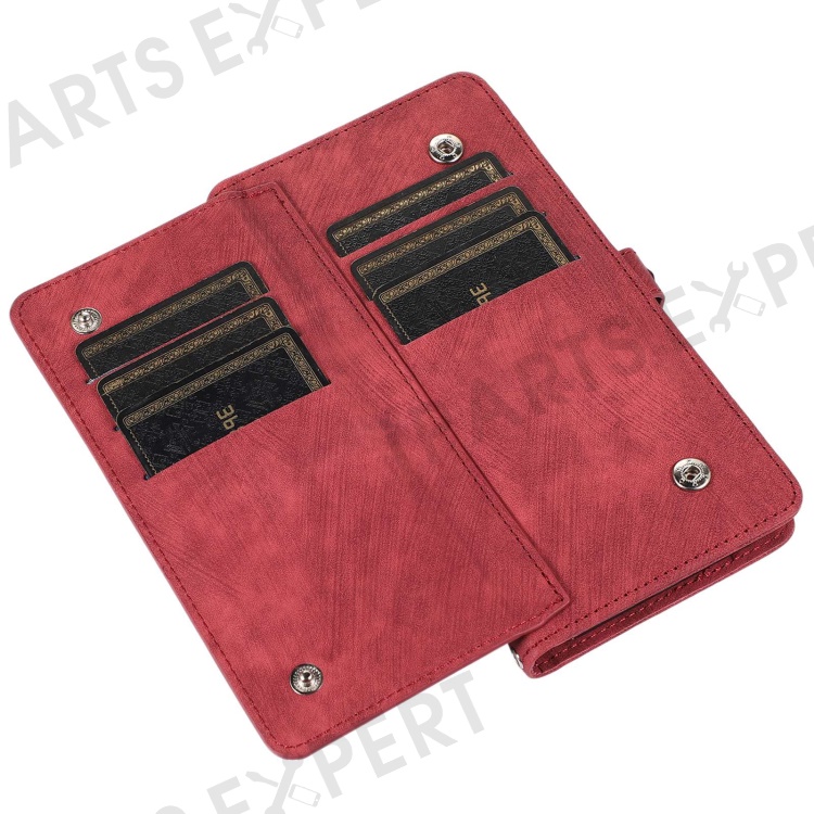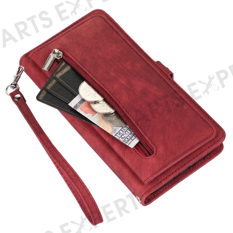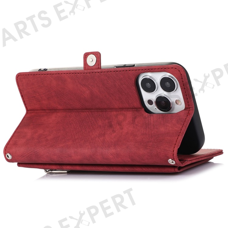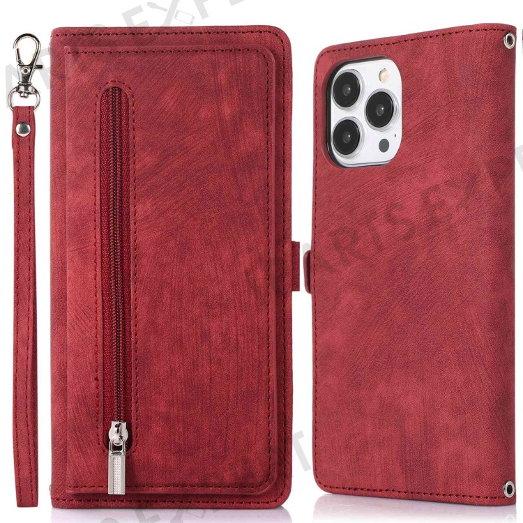 For iPhone 13 Pro Max 6.7 inch Multi-Functional 9 Card Slots Stand Protective Cover PU Leather Wallet Case with Zipper Pocket and Wrist Strap - Red