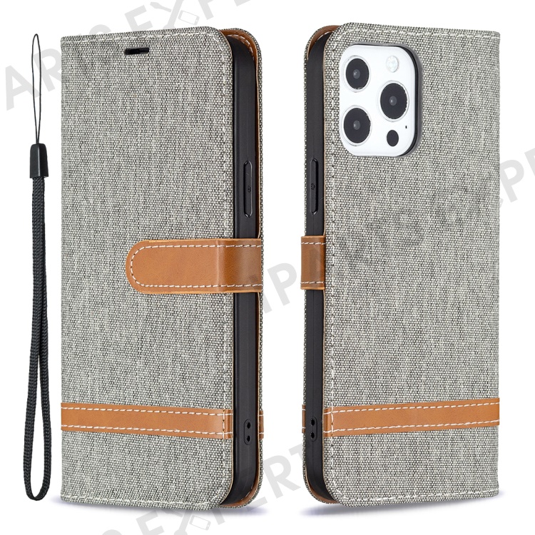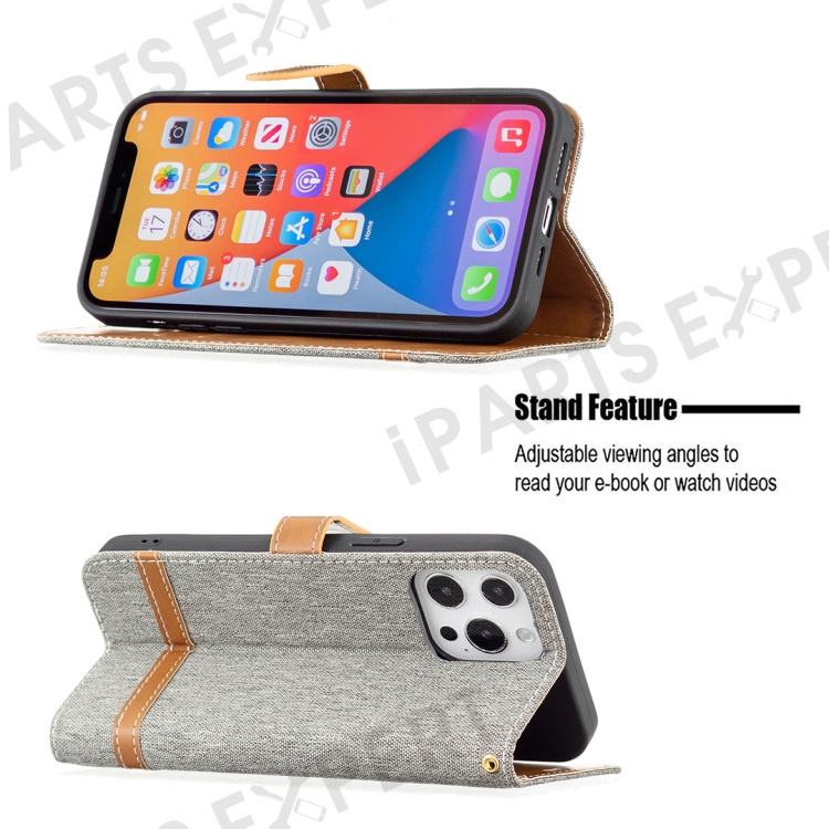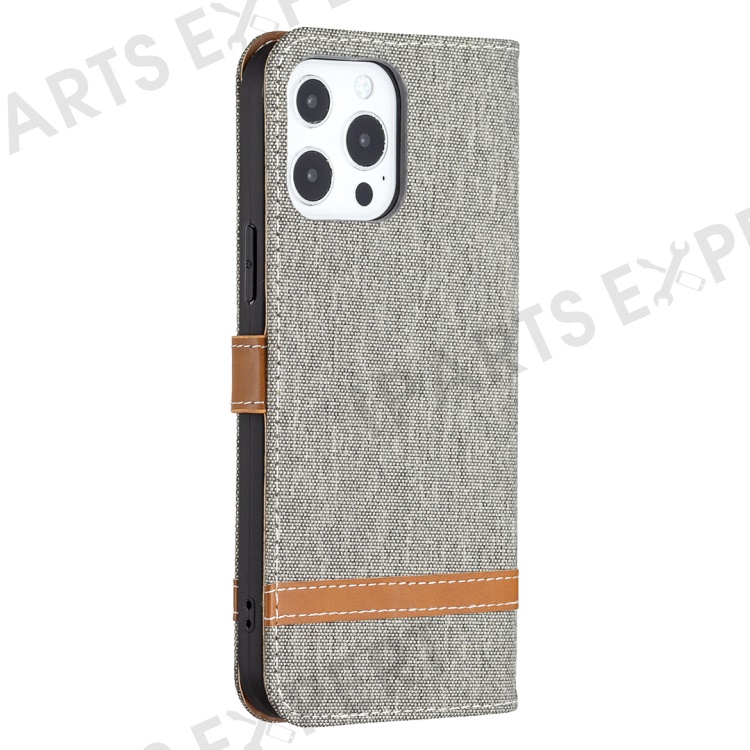 For iPhone 13 Pro Max 6.7 inch Wallet Design Drop-Proof Jeans Cloth Splicing Leather Stand Phone Cover - Grey