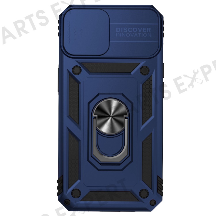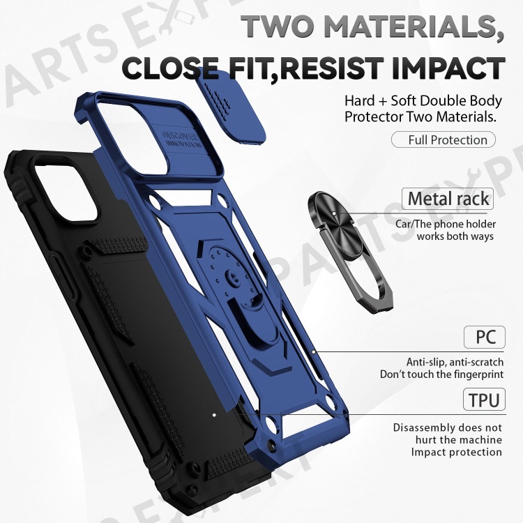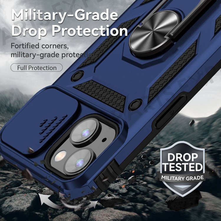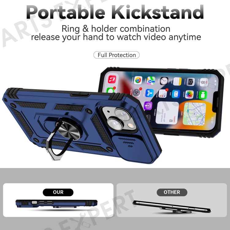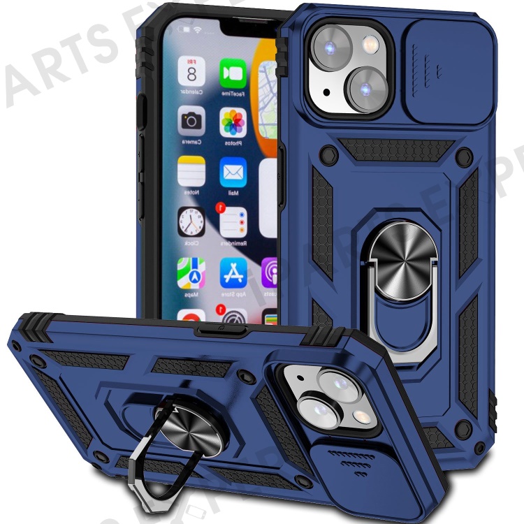 For iPhone 14 6.1 inch 360-degree Rotary Kickstand Case Hard PC + TPU All-inclusive Protection Phone Cover with Slide Camera Protection Cover - Blue