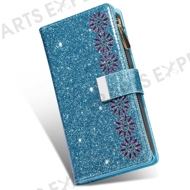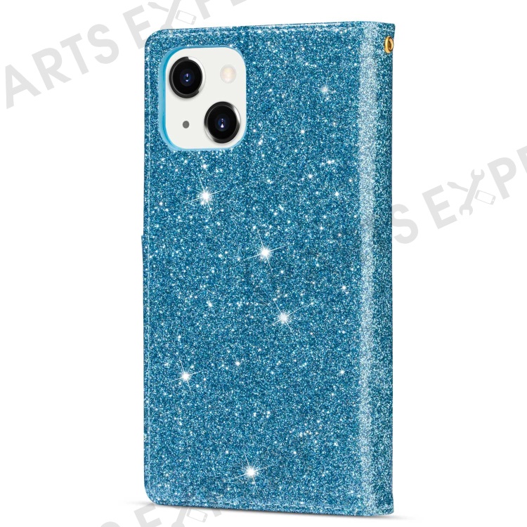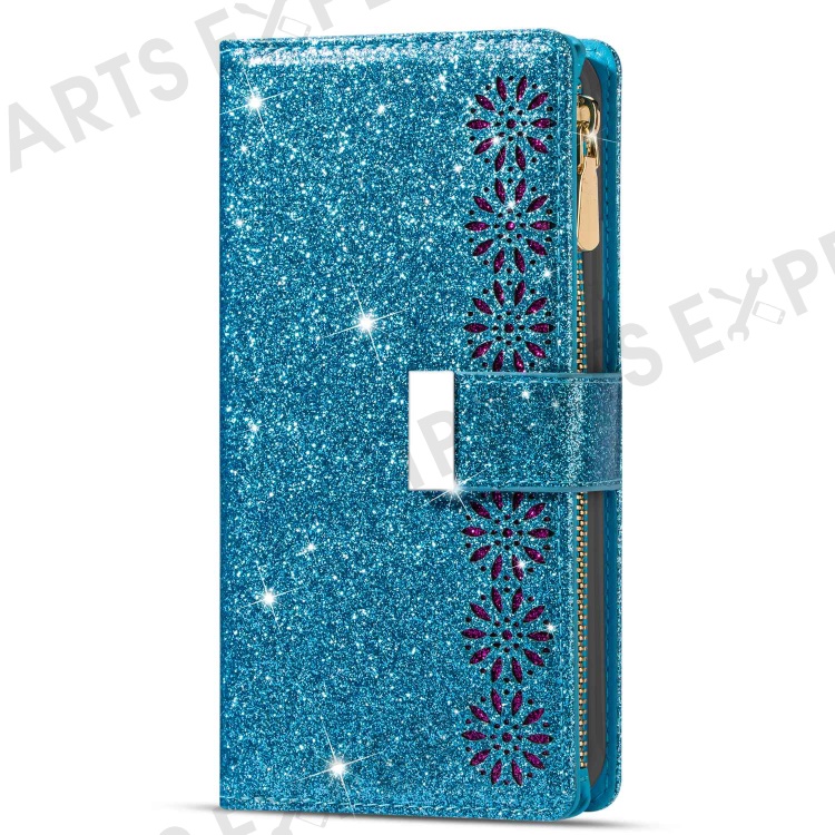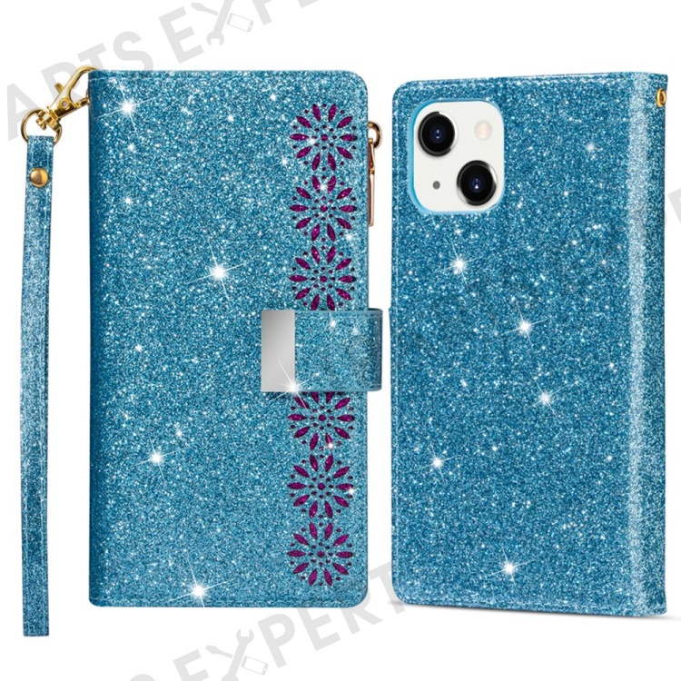 For iPhone 14 6.1 inch Anti-scratch Flip Leather Case, Laser Carving Glittery Starry Style Zipper Wallet Stand with Strap - Blue