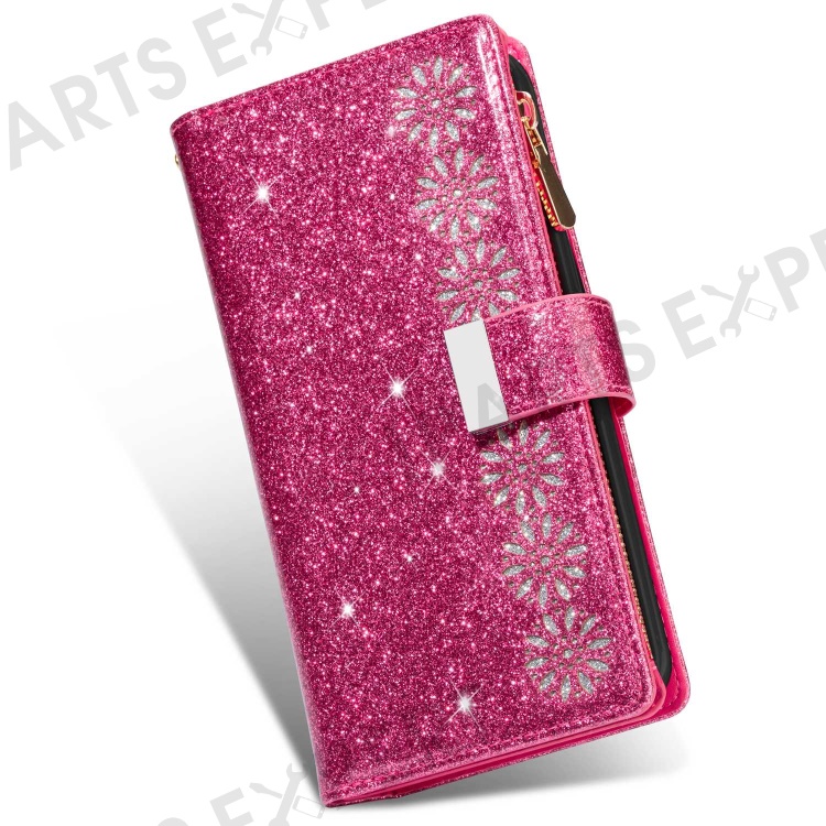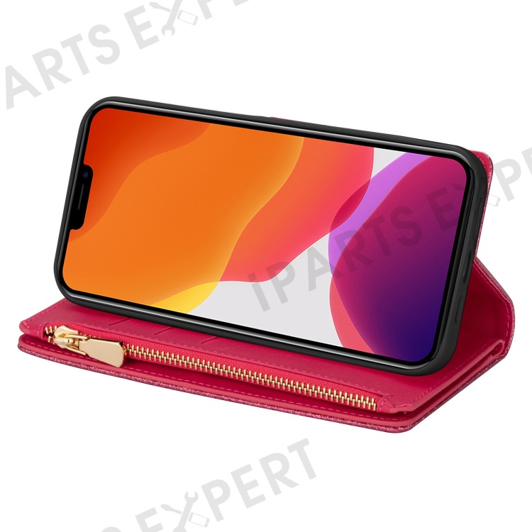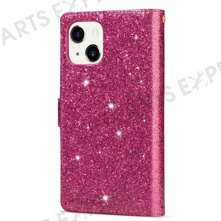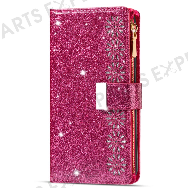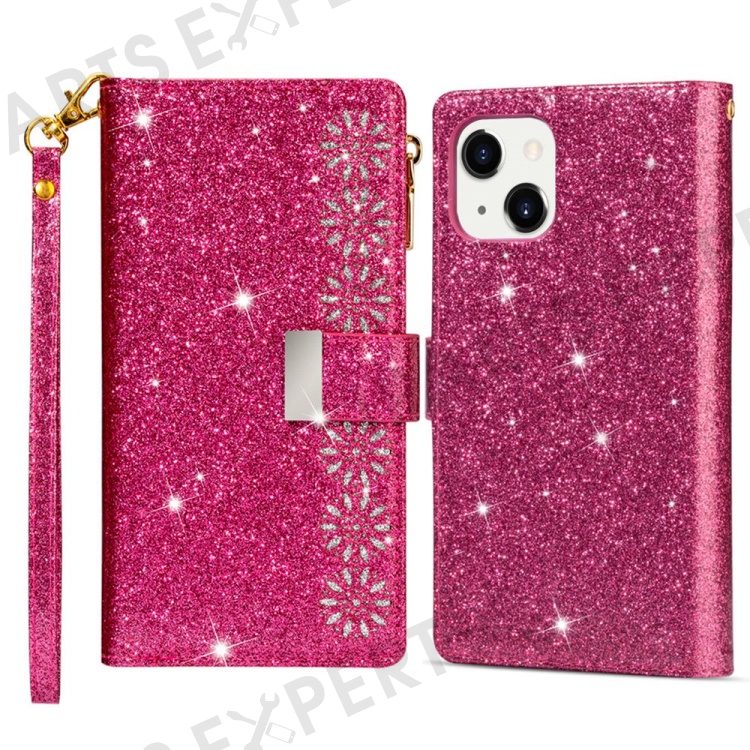 For iPhone 14 6.1 inch Anti-scratch Flip Leather Case, Laser Carving Glittery Starry Style Zipper Wallet Stand with Strap - Rose
