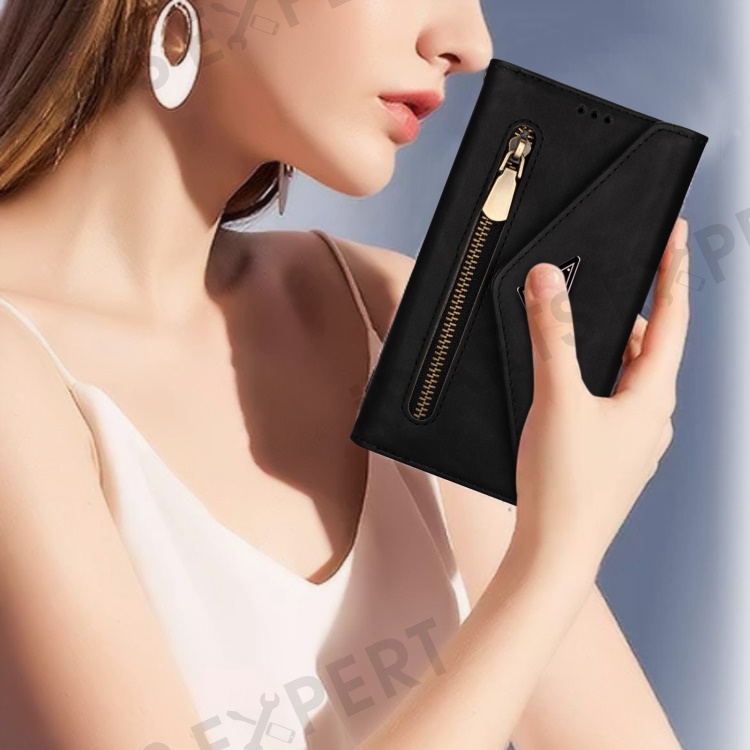 For iPhone 14 6.1 inch Anti-scratch Phone Case PU Leather Skin-touch Feeling Zipper Wallet Stand Cover with Short + Long Strap - Black