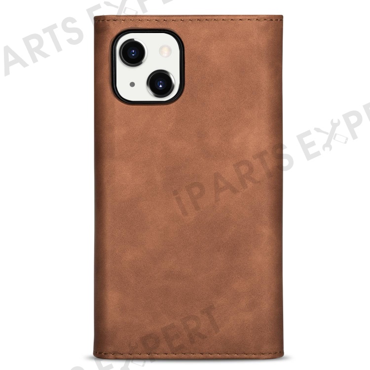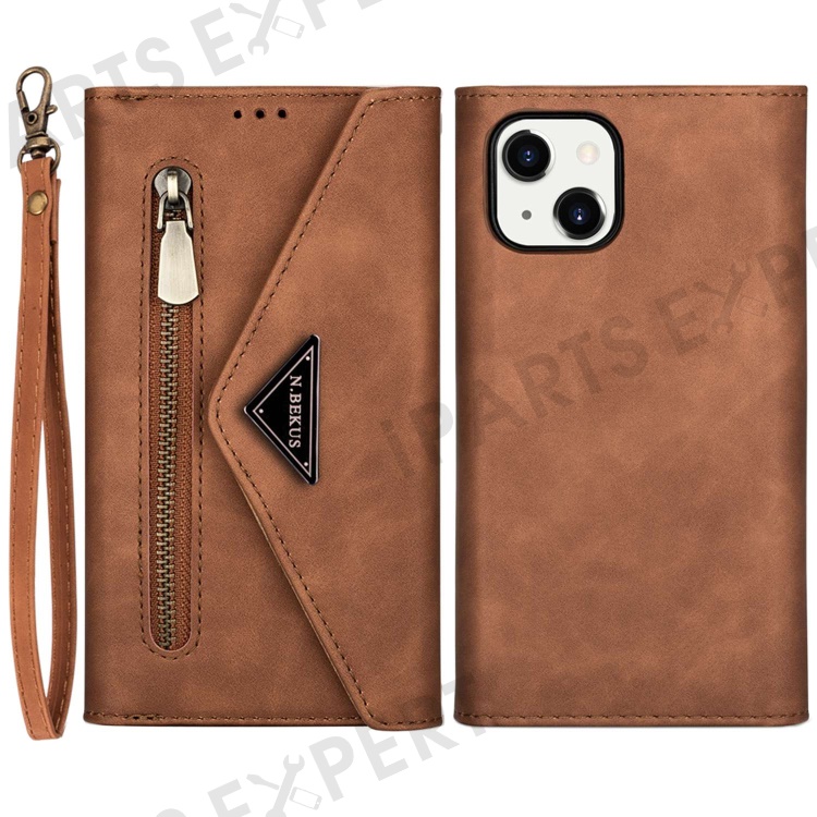 For iPhone 14 6.1 inch Anti-scratch Phone Case PU Leather Skin-touch Feeling Zipper Wallet Stand Cover with Short + Long Strap - Brown
