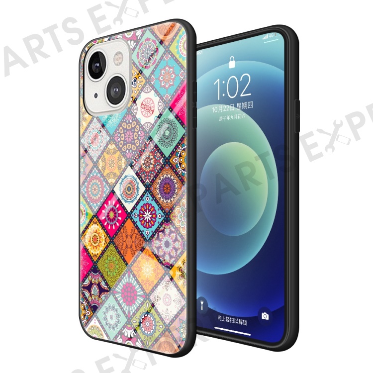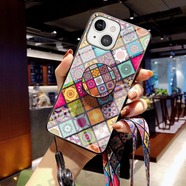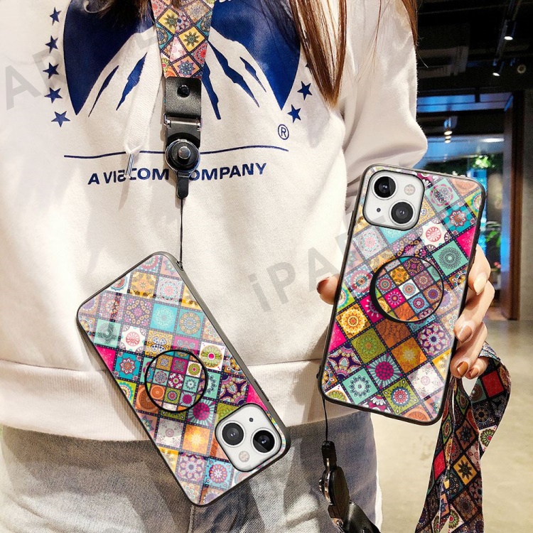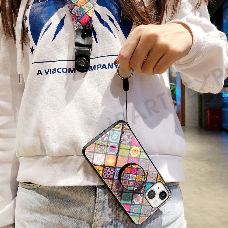 For iPhone 14 6.1 inch Anti-wear Drop-proof Flower Pattern Tempered Glass + Hard PC Phone Case Soft TPU Kickstand Back Cover with Lanyard - Color Pattern