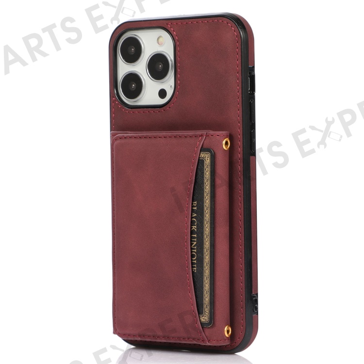 For iPhone 14 6.1 inch Drop-Proof Phone Wallet Case Kickstand Multifunctional Well-Protected Mobile Phone Back Cover Card Holder - Wine Red