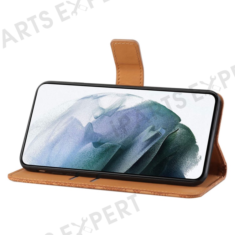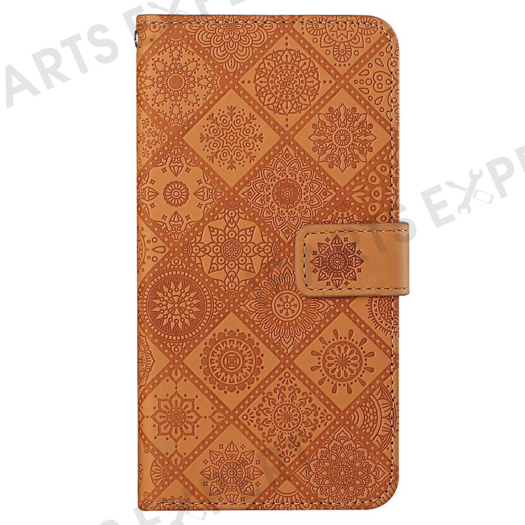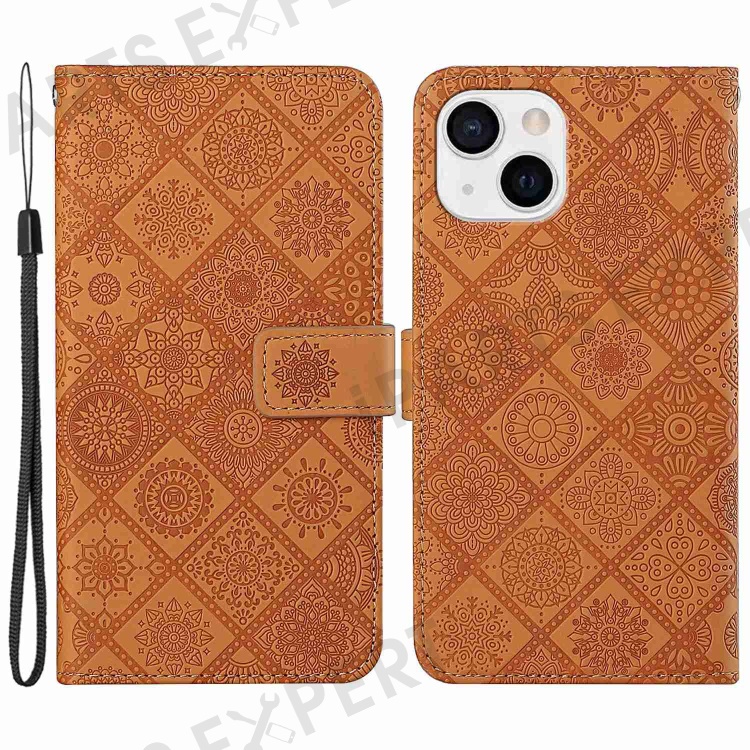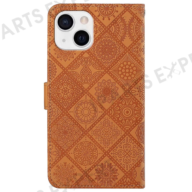 For iPhone 14 6.1 inch Ethnic Style Flower Imprinted Case Anti-scratch PU Leather Stand Wallet Feature Phone Shell - Brown