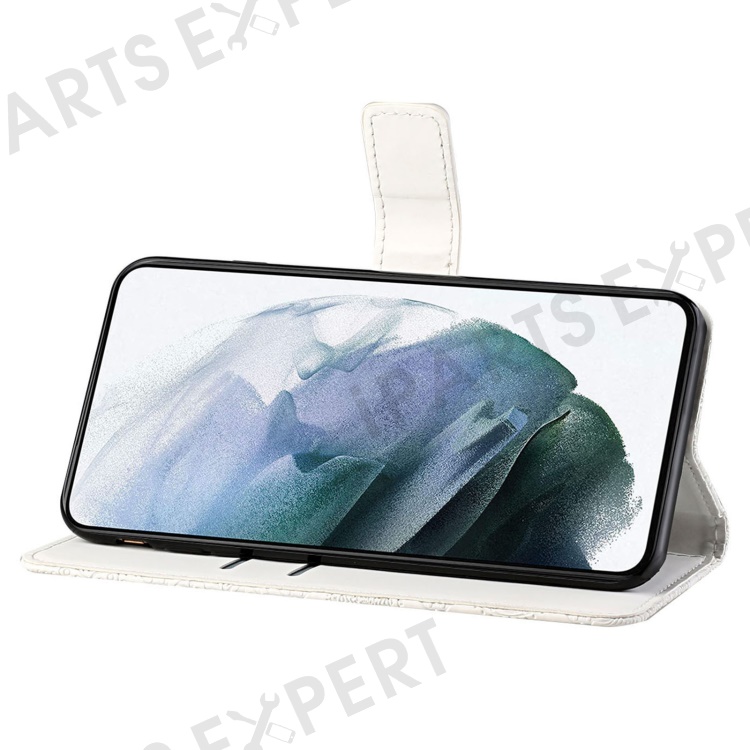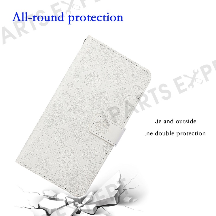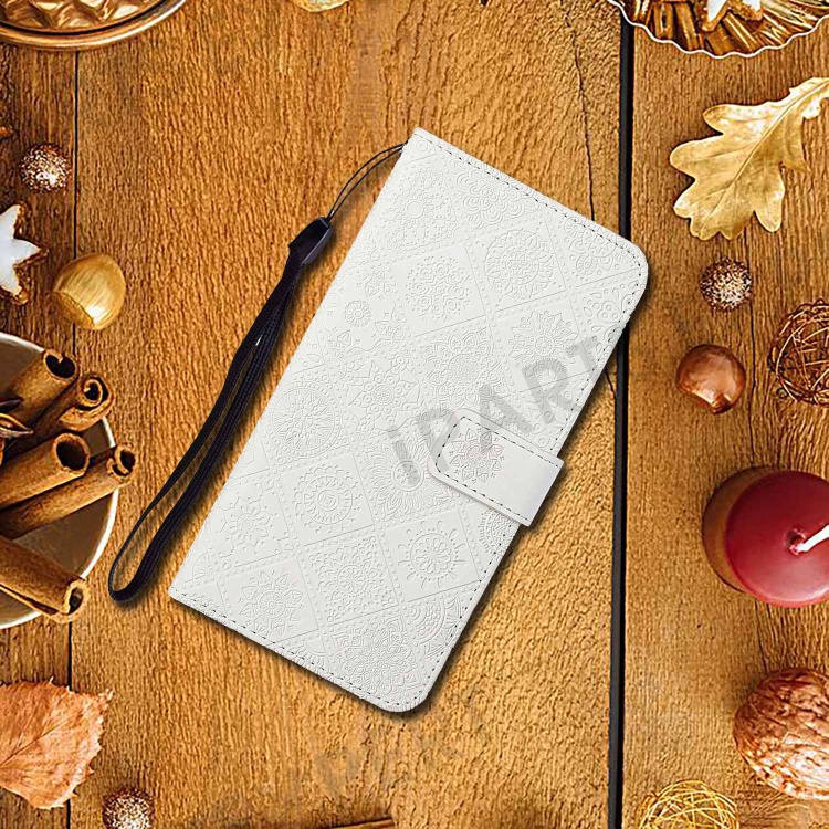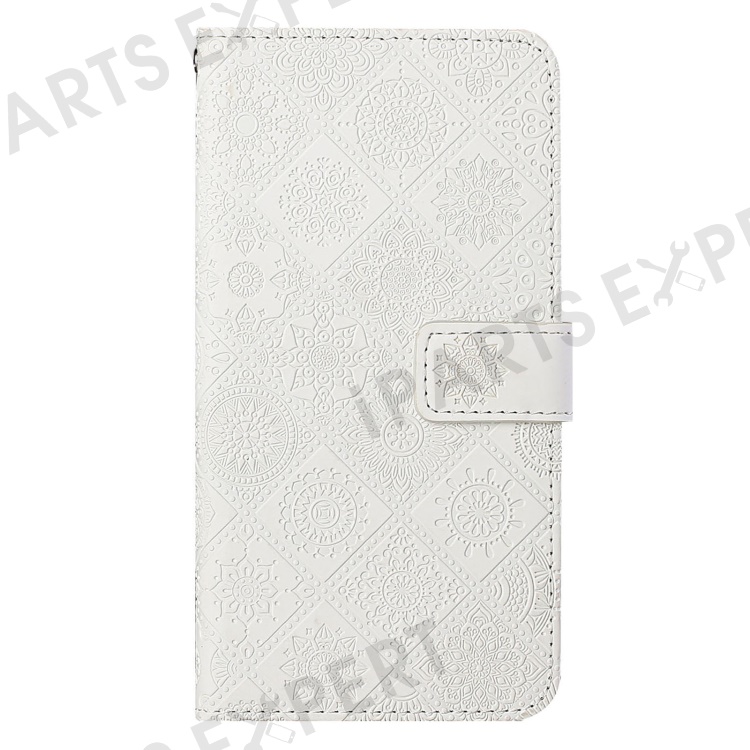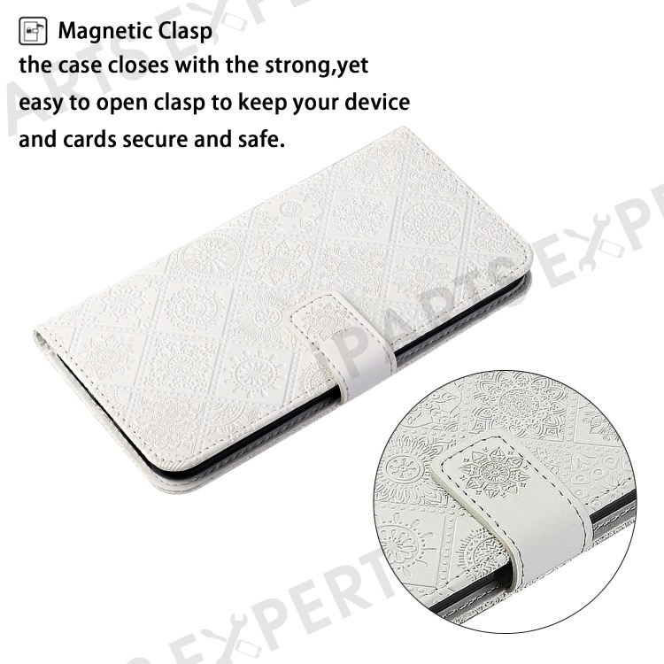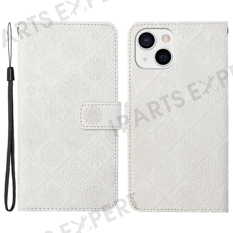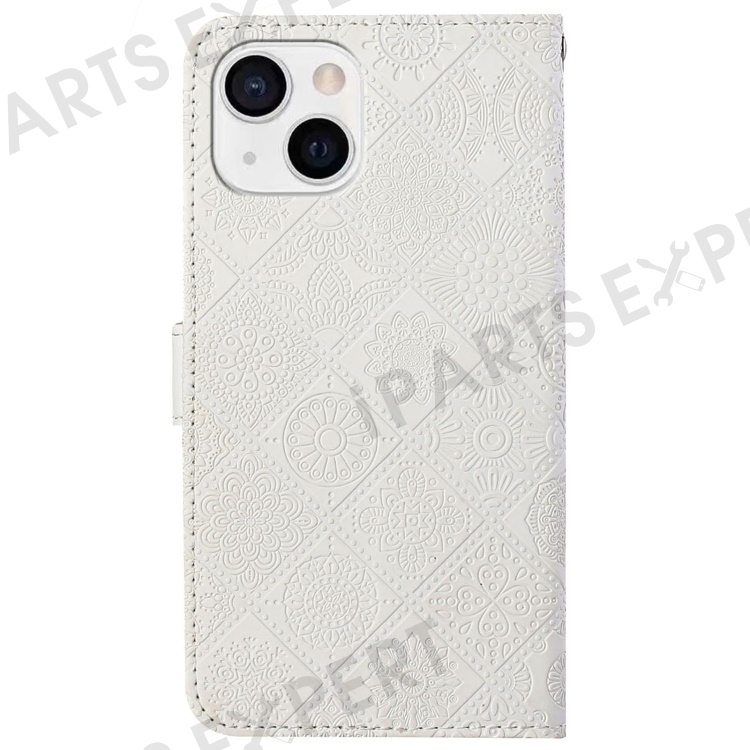 For iPhone 14 6.1 inch Ethnic Style Flower Imprinted Case Anti-scratch PU Leather Stand Wallet Feature Phone Shell - White