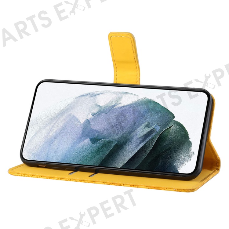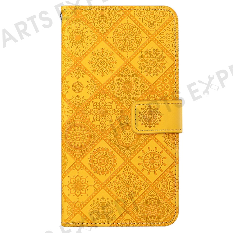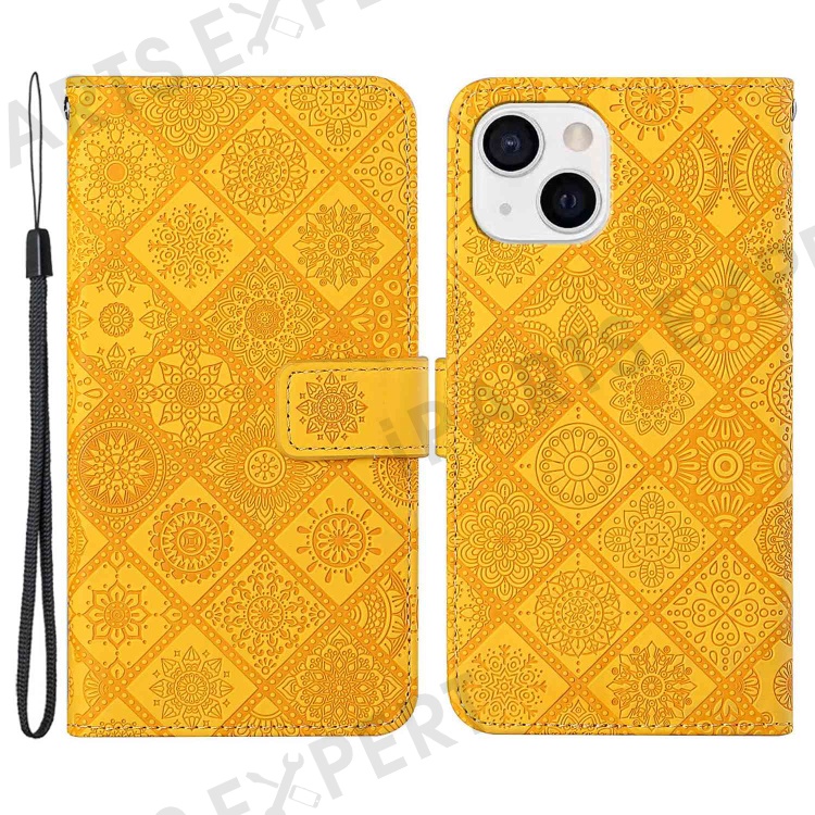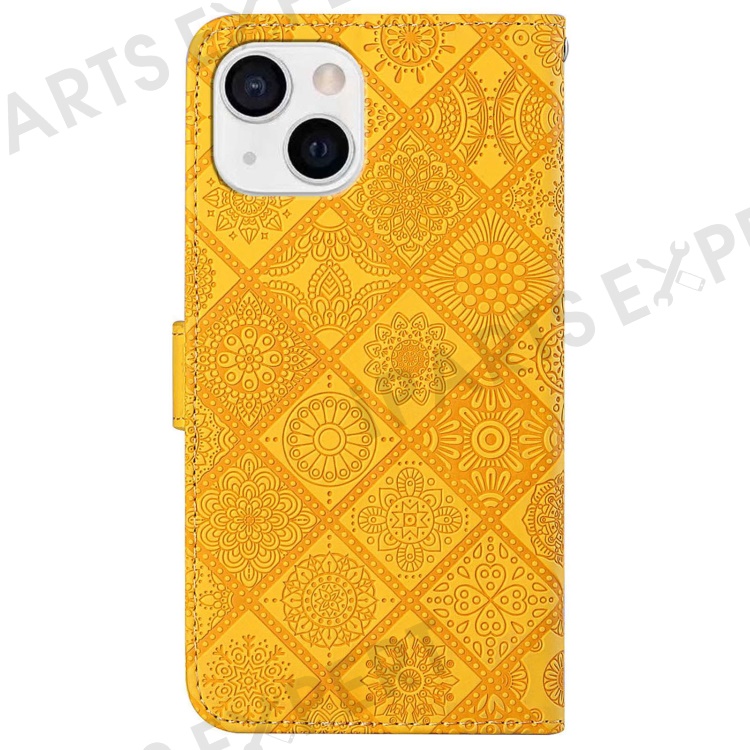 For iPhone 14 6.1 inch Ethnic Style Flower Imprinted Case Anti-scratch PU Leather Stand Wallet Feature Phone Shell - Yellow
