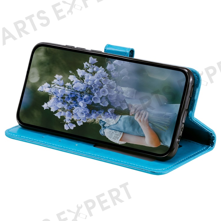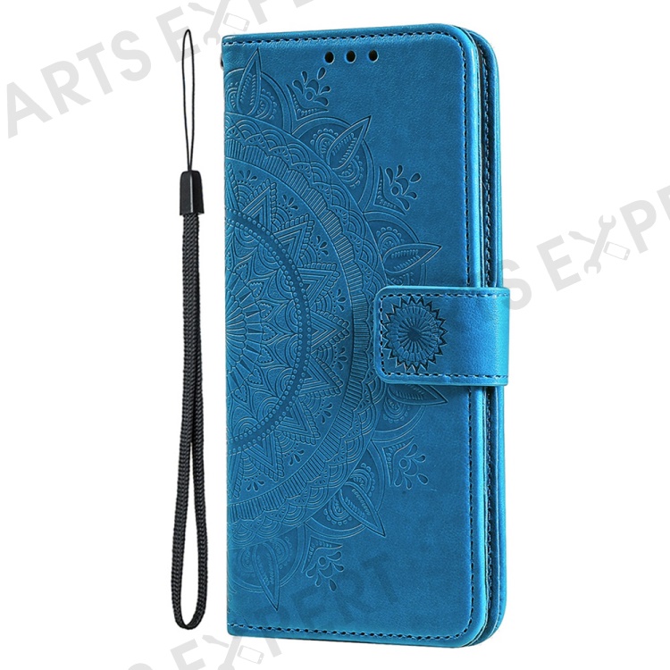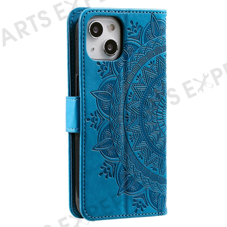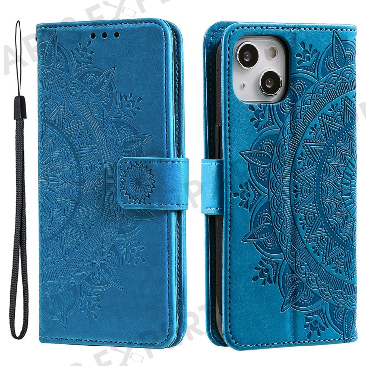 For iPhone 14 6.1 inch Imprinted Mandala Flower Pattern Folding Stand PU Leather Case Magnetic Clasp Wallet Flip Cover with Strap - Blue