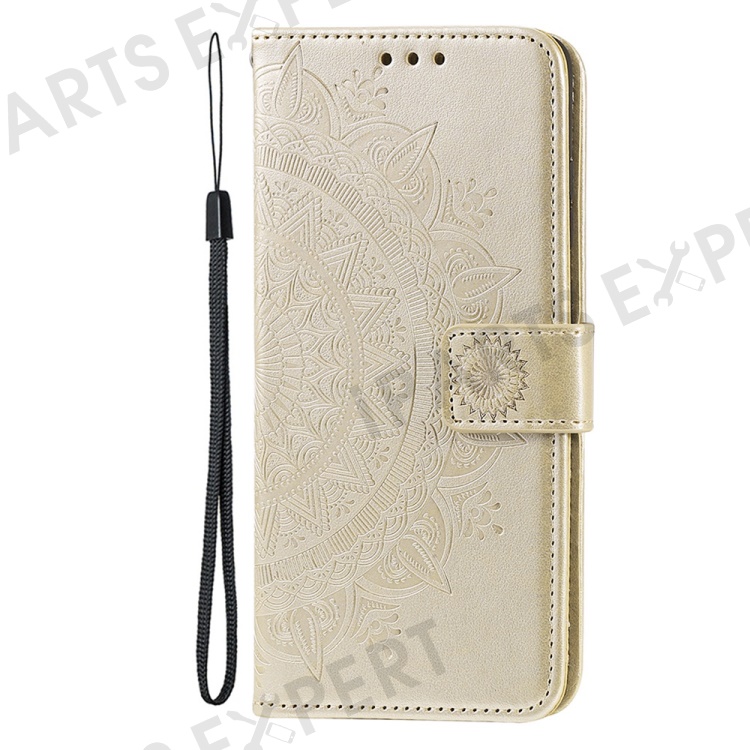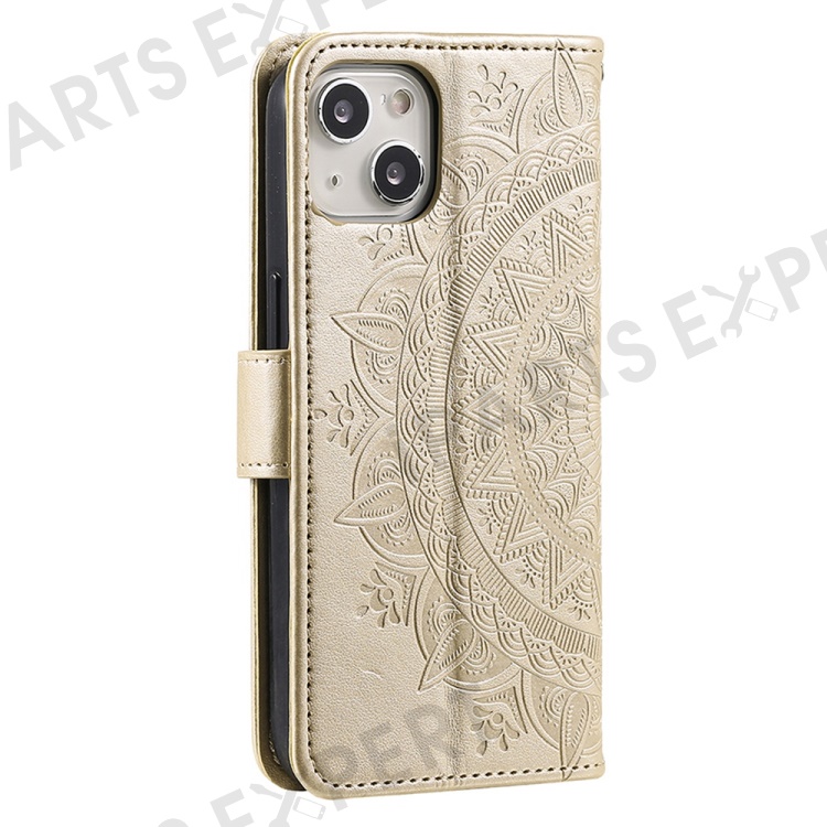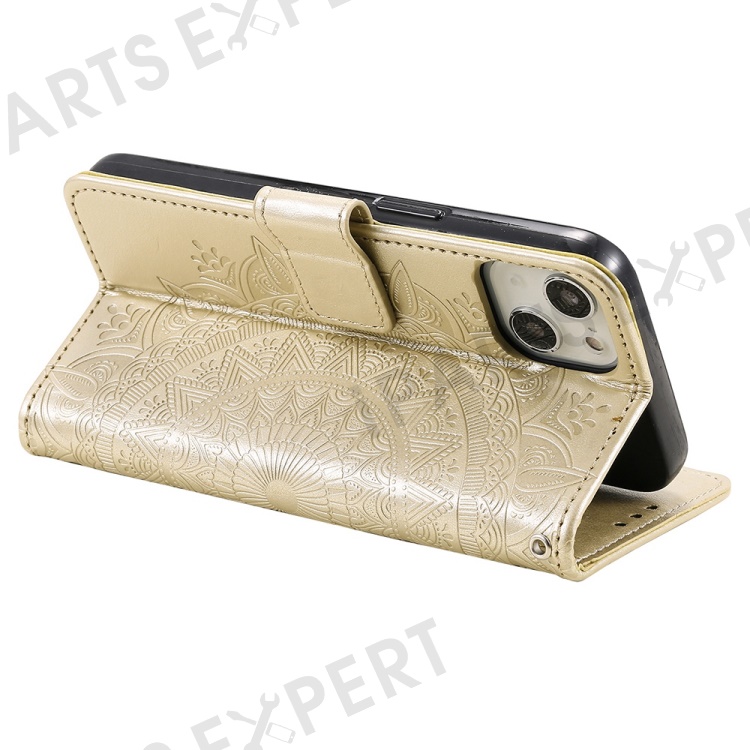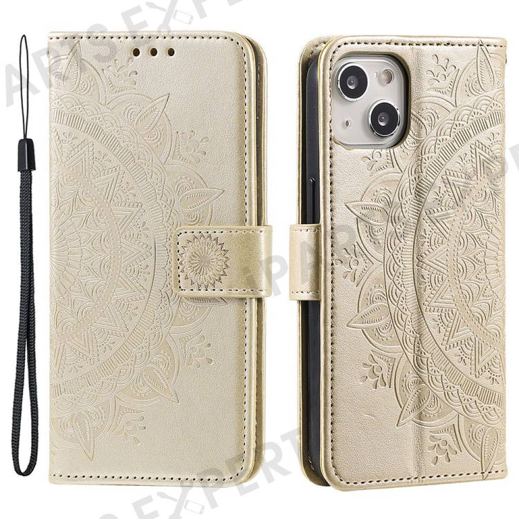 For iPhone 14 6.1 inch Imprinted Mandala Flower Pattern Folding Stand PU Leather Case Magnetic Clasp Wallet Flip Cover with Strap - Gold