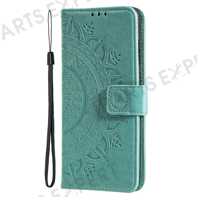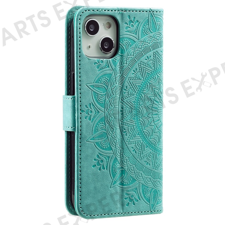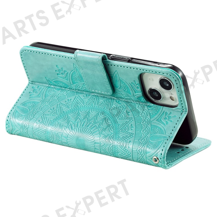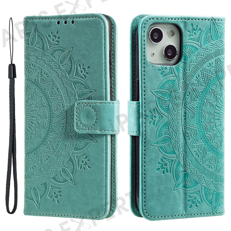 For iPhone 14 6.1 inch Imprinted Mandala Flower Pattern Folding Stand PU Leather Case Magnetic Clasp Wallet Flip Cover with Strap - Green