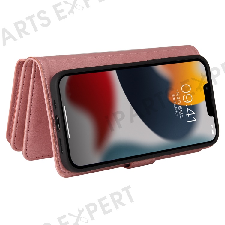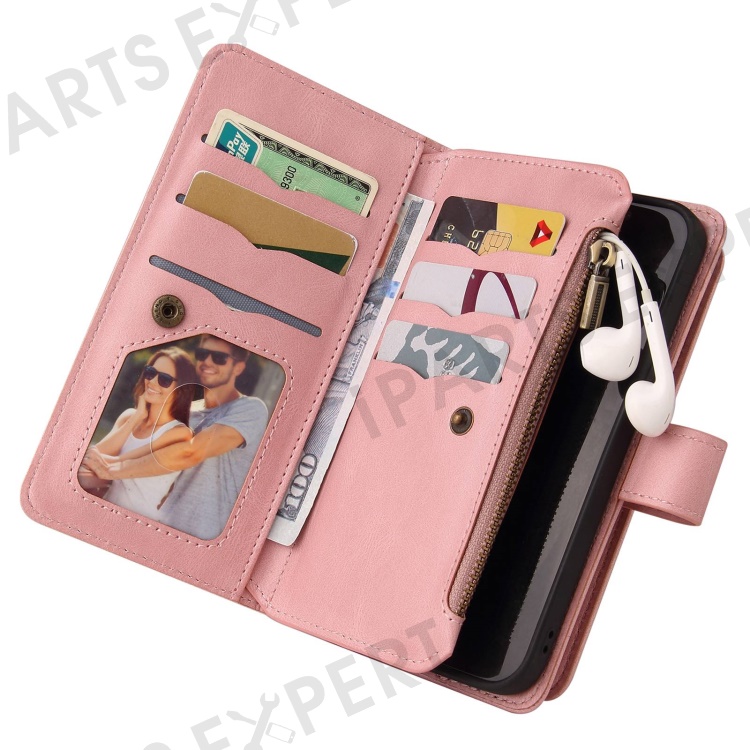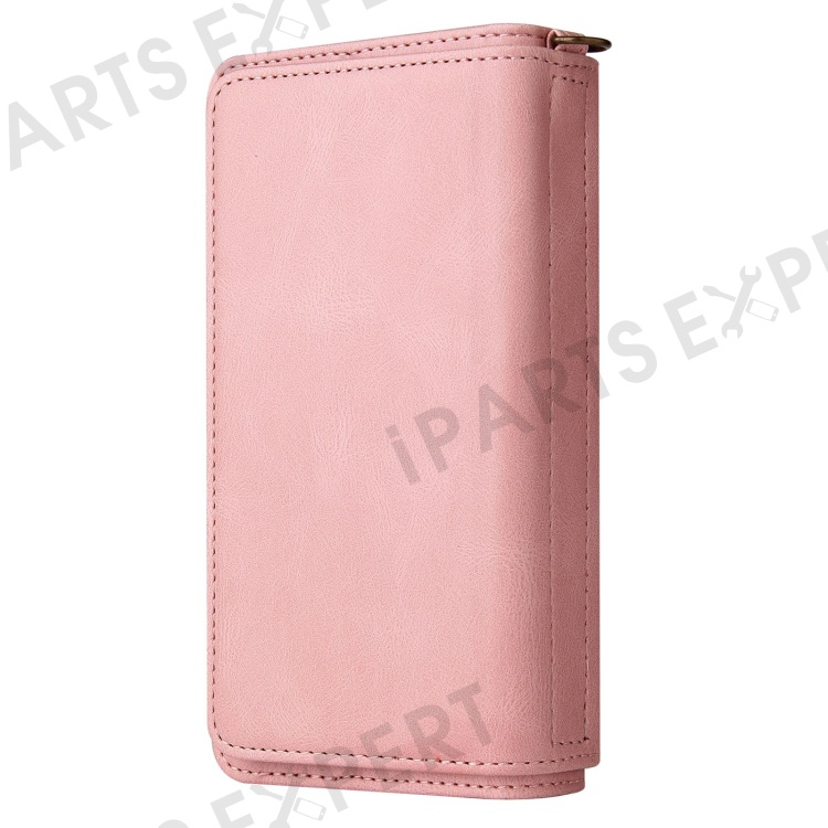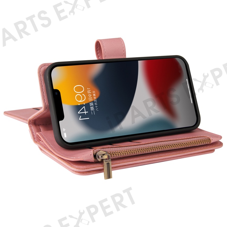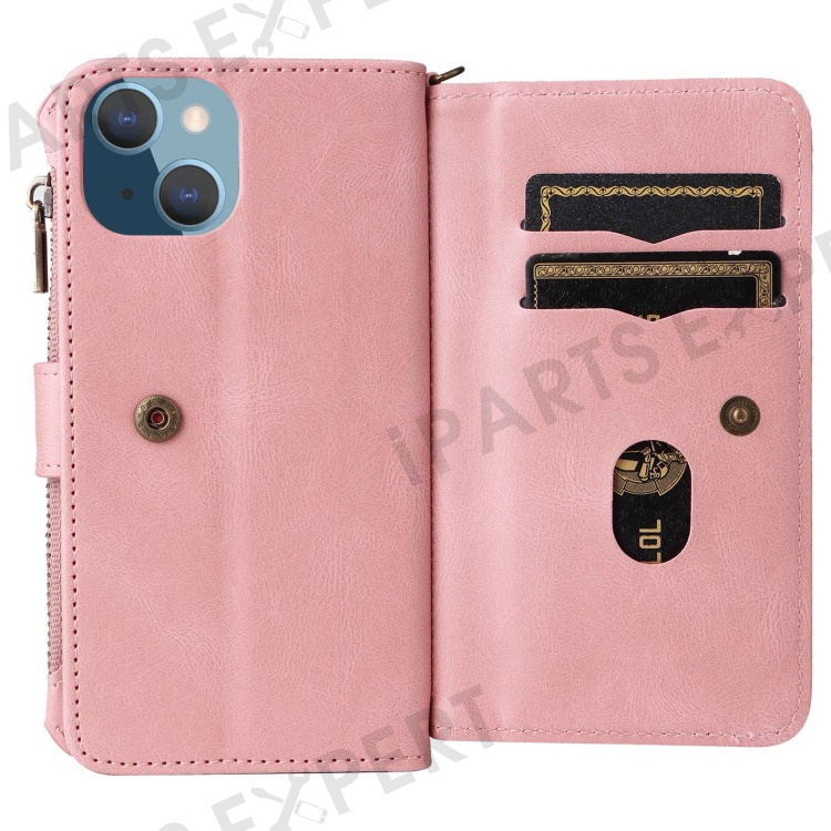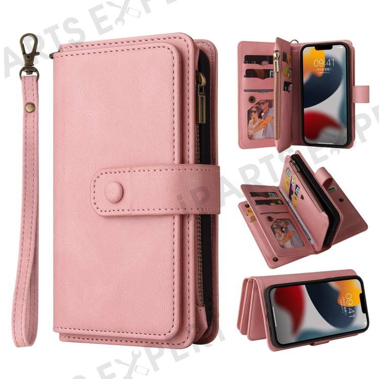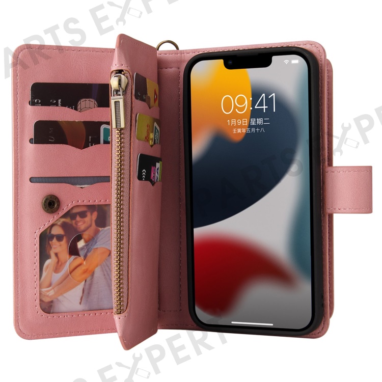 For iPhone 14 Zipper Wallet Case with 15 Card Slots and Strap Leather Phone Cover - Pink