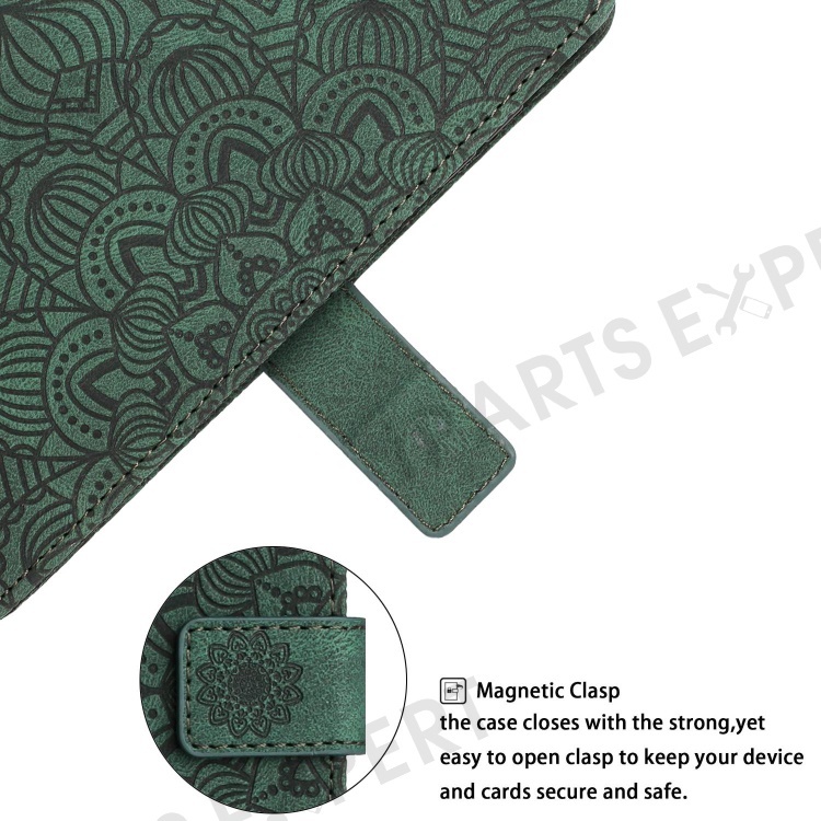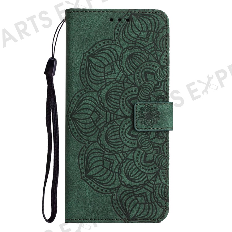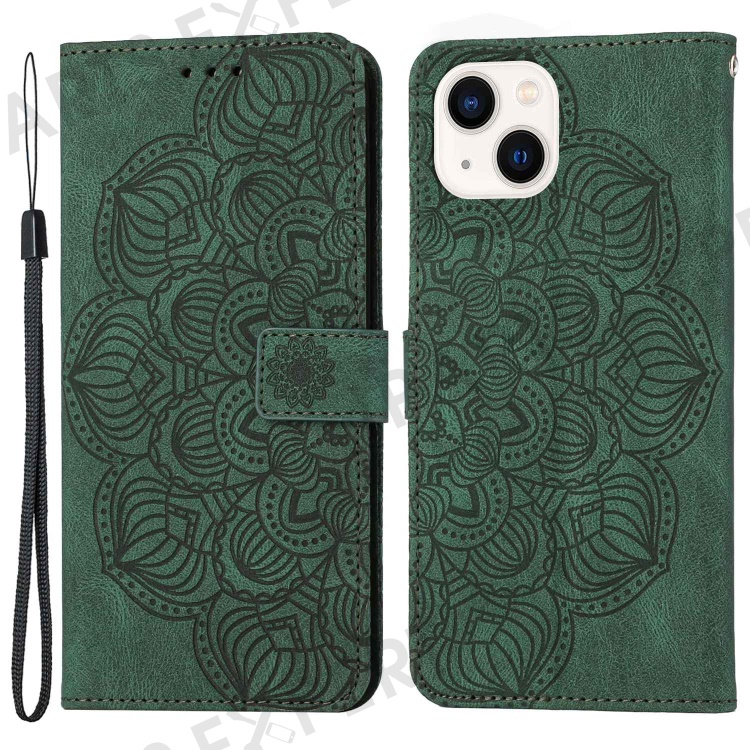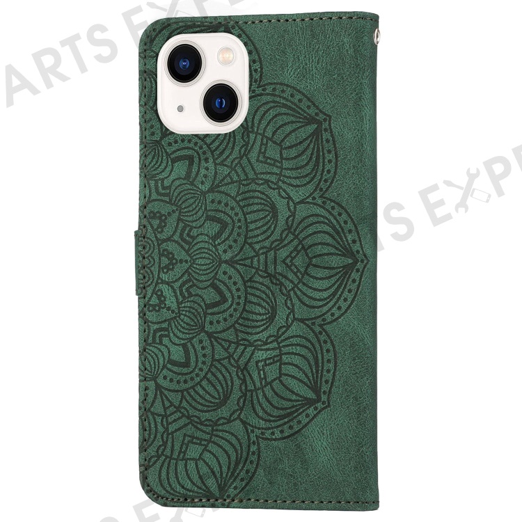For iPhone 14 6.1 inch Mandala Flower Imprinted PU Leather Magnetic Flip Cover Stand Feature Hand Strap Wallet Purse Case - Green