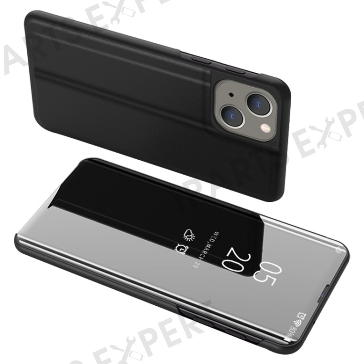 For iPhone 14 6.1 inch PU Leather Supporting Stand Phone Case View Window Electroplate Mirror Surface Phone Anti-scratch Cover - Black