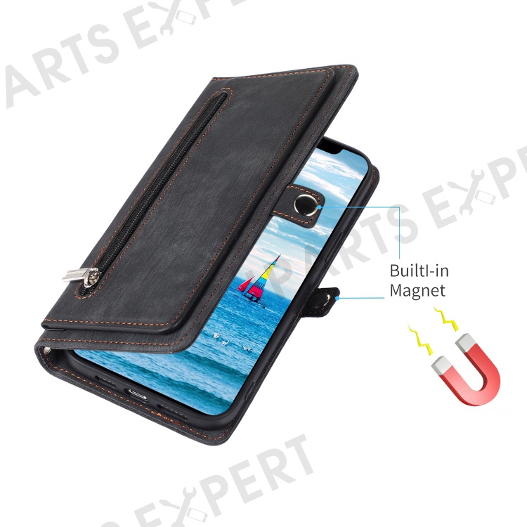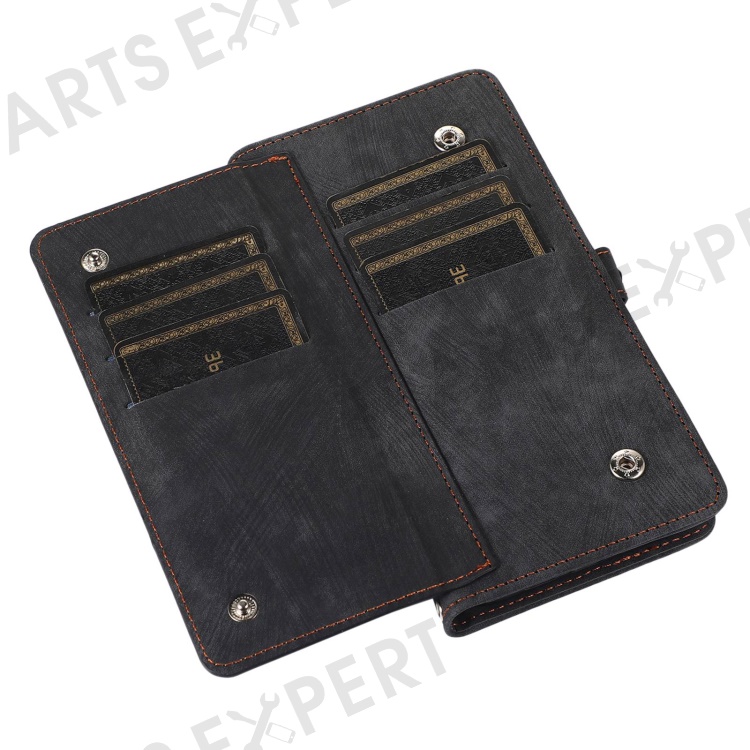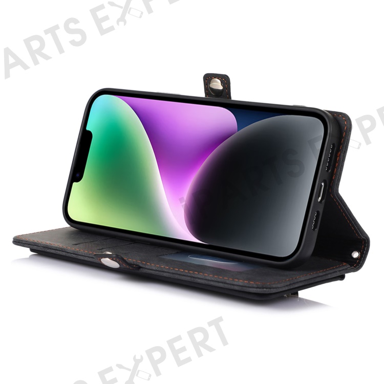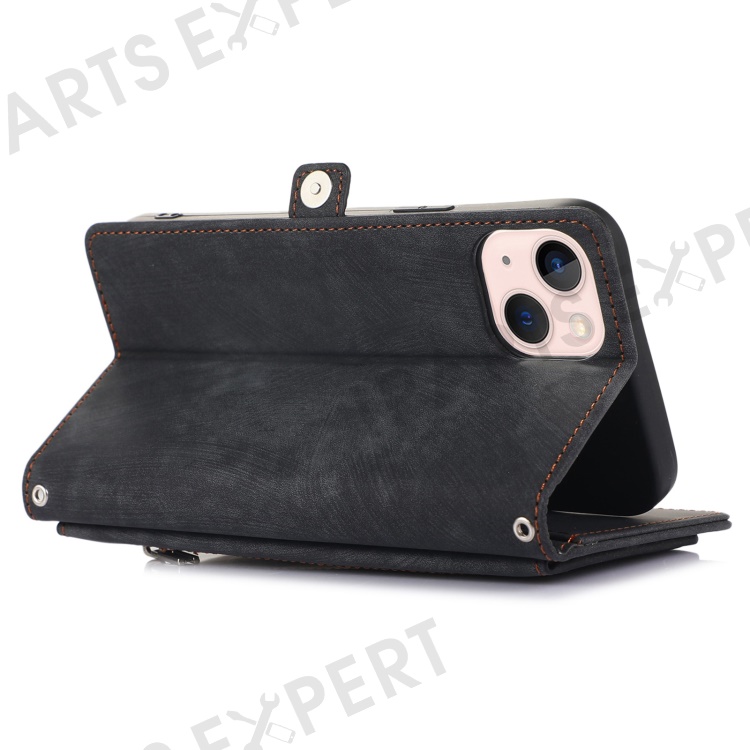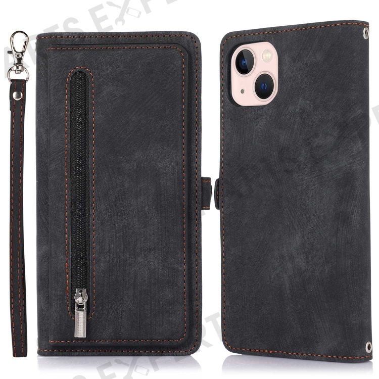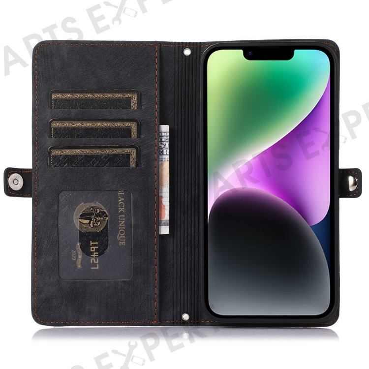 For iPhone 14 6.1 inch Zipper Pocket Design 9 Card Slots Phone Wallet Case PU Leather Stand Shockproof Cover with Wrist Strap - Black